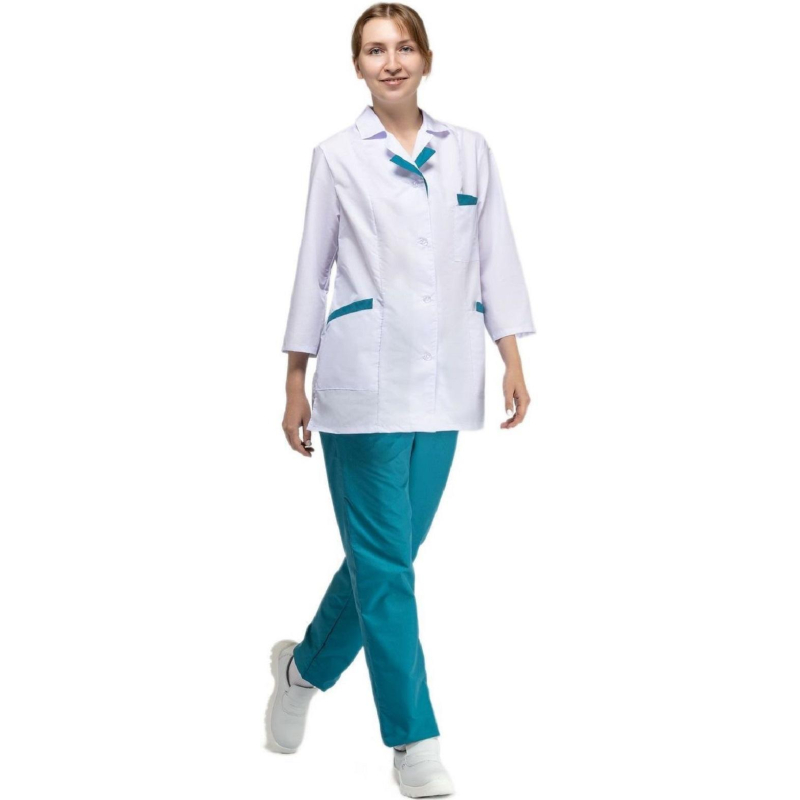 Костюм медицинский м01-КРБ (куртка+брюки). Размер: 56-58. Рост: 158-164. Куртка с застежкой на пуговицы, накладными карманами и с фигурной отделкой на лацканах и карманах. Ширина по линии талии регулируется хлястиком. Брюки свободного покроя на резинке. Ткань: Ти-Си (состав: 65% - полиэфир, 35% - хлопок). Плотность: 120 гр/м2.Коллекция медицинской униформы м01 представлена комплектами куртка с брюками м01-КБР и халатами м01-ХЛ. Продукция не является изделием медицинского назначения, производится согласно требованиям ГОСТ 12.4.280-2014. Рекомендуется для работников медицинских, санитарных, лечебно-профилактических и других организаций или учреждений здравоохранения: высший, средний и младший персонал (врачи, медицинские сестры, акушеры, техники, лаборанты, массажисты, фармацевты, сиделки, санитарки и т.д.), административно-хозяйственной группы (заведующие, кладовщики, кухонный персонал и т.д.). Изделия отшиты из белой ткани, но с сиреневым оттенком, связано это со спецификой отбеливания, чтобы ткань не желтила. Цвет стабилизируется после нескольких стирок.