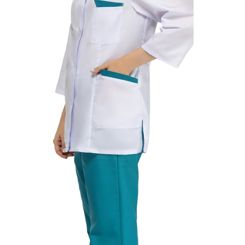 Костюм медицинский м01-КРБ (куртка+брюки). Размер: 60-62. Рост: 158-164. Куртка с застежкой на пуговицы, накладными карманами и с фигурной отделкой на лацканах и карманах. Ширина по линии талии регулируется хлястиком. Брюки свободного покроя на резинке. Ткань: Ти-Си (состав: 65% - полиэфир, 35% - хлопок). Плотность: 120 гр/м2.Коллекция медицинской униформы м01 представлена комплектами куртка с брюками м01-КБР и халатами м01-ХЛ. Продукция не является изделием медицинского назначения, производится согласно требованиям ГОСТ 12.4.280-2014. Рекомендуется для работников медицинских, санитарных, лечебно-профилактических и других организаций или учреждений здравоохранения: высший, средний и младший персонал (врачи, медицинские сестры, акушеры, техники, лаборанты, массажисты, фармацевты, сиделки, санитарки и т.д.), административно-хозяйственной группы (заведующие, кладовщики, кухонный персонал и т.д.). Изделия отшиты из белой ткани, но с сиреневым оттенком, связано это со спецификой отбеливания, чтобы ткань не желтила. Цвет стабилизируется после нескольких стирок.