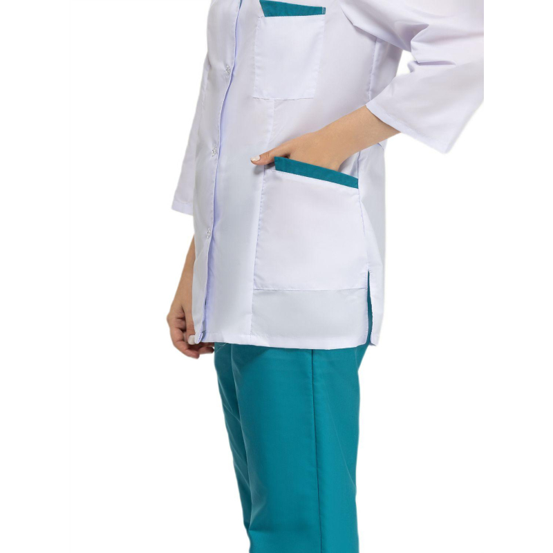 Костюм медицинский м01-КРБ (куртка+брюки). Размер: 48-50. Рост: 170-176. Куртка с застежкой на пуговицы, накладными карманами и с фигурной отделкой на лацканах и карманах. Ширина по линии талии регулируется хлястиком. Брюки свободного покроя на резинке. Ткань: Ти-Си (состав: 65% - полиэфир, 35% - хлопок). Плотность: 120 гр/м2.Коллекция медицинской униформы м01 представлена комплектами куртка с брюками м01-КБР и халатами м01-ХЛ. Продукция не является изделием медицинского назначения, производится согласно требованиям ГОСТ 12.4.280-2014. Рекомендуется для работников медицинских, санитарных, лечебно-профилактических и других организаций или учреждений здравоохранения: высший, средний и младший персонал (врачи, медицинские сестры, акушеры, техники, лаборанты, массажисты, фармацевты, сиделки, санитарки и т.д.), административно-хозяйственной группы (заведующие, кладовщики, кухонный персонал и т.д.). Изделия отшиты из белой ткани, но с сиреневым оттенком, связано это со спецификой отбеливания, чтобы ткань не желтила. Цвет стабилизируется после нескольких стирок.