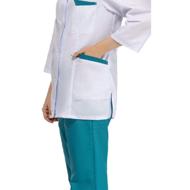 Костюм медицинский м01-КРБ (куртка+брюки). Размер: 64-66. Рост: 158-164. Куртка с застежкой на пуговицы, накладными карманами и с фигурной отделкой на лацканах и карманах. Ширина по линии талии регулируется хлястиком. Брюки свободного покроя на резинке. Ткань: Ти-Си (состав: 65% - полиэфир, 35% - хлопок). Плотность: 120 гр/м2.Коллекция медицинской униформы м01 представлена комплектами куртка с брюками м01-КБР и халатами м01-ХЛ. Продукция не является изделием медицинского назначения, производится согласно требованиям ГОСТ 12.4.280-2014. Рекомендуется для работников медицинских, санитарных, лечебно-профилактических и других организаций или учреждений здравоохранения: высший, средний и младший персонал (врачи, медицинские сестры, акушеры, техники, лаборанты, массажисты, фармацевты, сиделки, санитарки и т.д.), административно-хозяйственной группы (заведующие, кладовщики, кухонный персонал и т.д.). Изделия отшиты из белой ткани, но с сиреневым оттенком, связано это со спецификой отбеливания, чтобы ткань не желтила. Цвет стабилизируется после нескольких стирок.