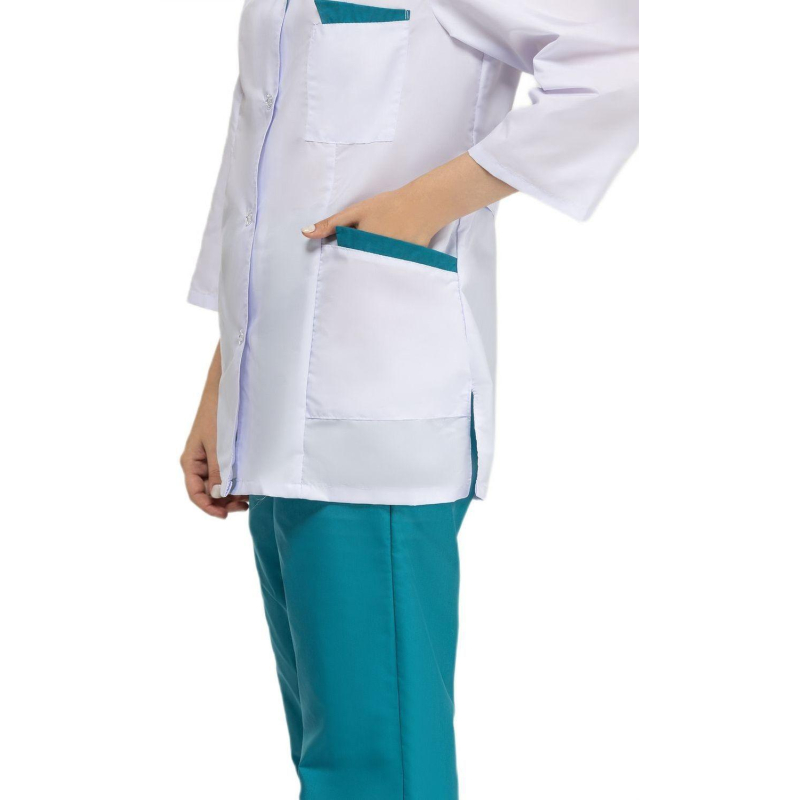Костюм медицинский м01-КРБ (куртка+брюки). Размер: 64-66. Рост: 170-176. Куртка с застежкой на пуговицы, накладными карманами и с фигурной отделкой на лацканах и карманах. Ширина по линии талии регулируется хлястиком. Брюки свободного покроя на резинке. Ткань: Ти-Си (состав: 65% - полиэфир, 35% - хлопок). Плотность: 120 гр/м2.Коллекция медицинской униформы м01 представлена комплектами куртка с брюками м01-КБР и халатами м01-ХЛ. Продукция не является изделием медицинского назначения, производится согласно требованиям ГОСТ 12.4.280-2014. Рекомендуется для работников медицинских, санитарных, лечебно-профилактических и других организаций или учреждений здравоохранения: высший, средний и младший персонал (врачи, медицинские сестры, акушеры, техники, лаборанты, массажисты, фармацевты, сиделки, санитарки и т.д.), административно-хозяйственной группы (заведующие, кладовщики, кухонный персонал и т.д.). Изделия отшиты из белой ткани, но с сиреневым оттенком, связано это со спецификой отбеливания, чтобы ткань не желтила. Цвет стабилизируется после нескольких стирок.