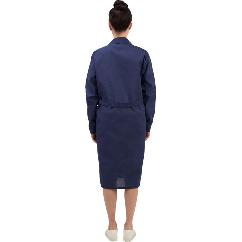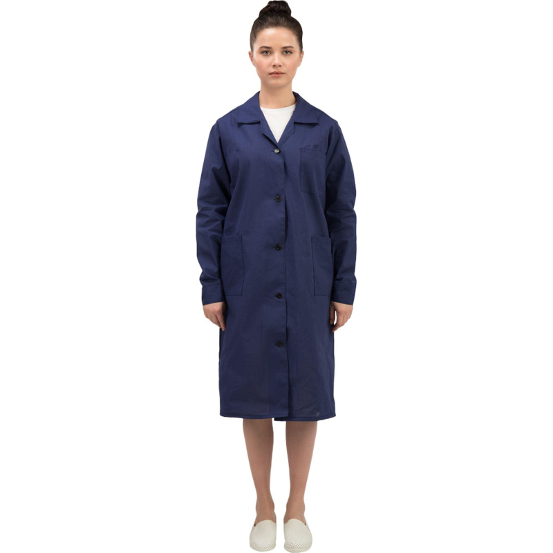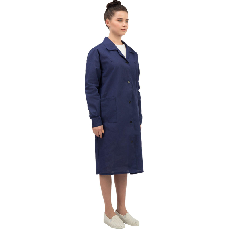 Халат рабочий у02-ХЛ женский синий (размер 60-62, рост 170-176) предназначен для защиты от общих производственных загрязнений и механических воздействий (истираний).Халат из бязи плотностью 142 г/м², состав 100% хлопок, Эта ткань обладает высоким уровнем гигроскопичности и прочности, что делает халат удобным для ежедневного использования в летний период.Защитные свойства:- Ми - защита от механических воздействий (истирания).- З - защита от общих производственных загрязнений.Халат имеет полуприлегающий силуэт с рельефными швами по переду и спинке, от плечевого шва до низа изделия, что обеспечивает удобную посадку. Рукава длинные, одношовные, с притачными манжетами застегивающиеся на петли с пуговицами. Застежка центральная бортовая, на петлях и пуговицах. В передней части расположены три накладных кармана: левый нагрудный и два нижних для удобного хранения необходимых мелочей. Воротник отложной придает изделию классический внешний вид. Ширина на уровне талии регулируется пи помощи двух полупоясов, застегивающихся на петли с пуговицами.Рекомендуется для защиты от незначительных загрязнений, бытовой и производственной пыли. Классическая модель для работников складов, мастерских, лабораторий, технического персонала.Рекомендации по уходу: cтирка при температуре не выше 40°C. Запрещается отбеливание. Гладить при температуре до 110°C. Химчистка запрещена.Халат соответствует требованиям ГОСТ 12.4.131-83.https://www.komus.ru/news/spravochnik-pokupatelya/vybor-razmera-spetsodezhdy/n/15/Подобрать размерЦвет на изображении товара может отличаться от оригинала из-за особенностей цветопередачи монитора.ЗАКОНОДАТЕЛЬНЫЕ И ТЕХНИЧЕСКИЕ ДОКУМЕНТЫ