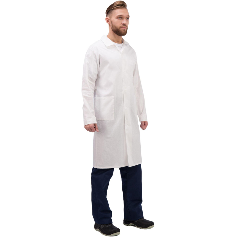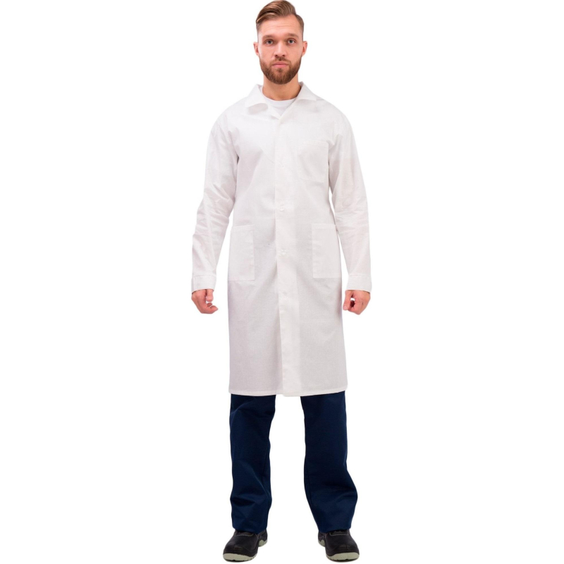 Халат рабочий у02-ХЛ мужской белый (размер 48-50, рост 182-188) предназначен для защиты от общих производственных загрязнений и механических воздействий (истираний).Халат из бязи плотностью 142 г/м², состав 100% хлопок, Эта ткань обладает высоким уровнем гигроскопичности и прочности, что делает халат удобным для ежедневного использования в летний период.Защитные свойства:- Ми - защита от механических воздействий (истирания).- З - защита от общих производственных загрязнений.Халат имеет полуприлегающий силуэт. Рукава длинные, одношовные, с притачными манжетами застегивающиеся на петли с пуговицами. Застежка центральная бортовая, на петлях и пуговицах. В передней части расположены три накладных кармана: левый нагрудный и два нижних для удобного хранения необходимых мелочей. Воротник отложной придает изделию классический внешний вид. По спинке от боковых швов расположен пояс.Рекомендуется для защиты от незначительных загрязнений, бытовой и производственной пыли. Классическая модель для работников складов, мастерских, лабораторий, технического персоналаРекомендации по уходу: cтирка при температуре не выше 40°C. Запрещается отбеливание. Гладить при температуре до 110°C. Химчистка запрещена.Халат соответствует требованиям ГОСТ 12.4.132-83.https://www.komus.ru/news/spravochnik-pokupatelya/vybor-razmera-spetsodezhdy/n/15/Подобрать размерЦвет на изображении товара может отличаться от оригинала из-за особенностей цветопередачи монитора.ЗАКОНОДАТЕЛЬНЫЕ И ТЕХНИЧЕСКИЕ ДОКУМЕНТЫ
