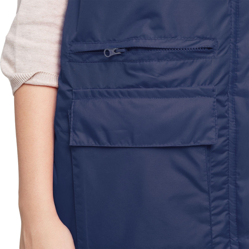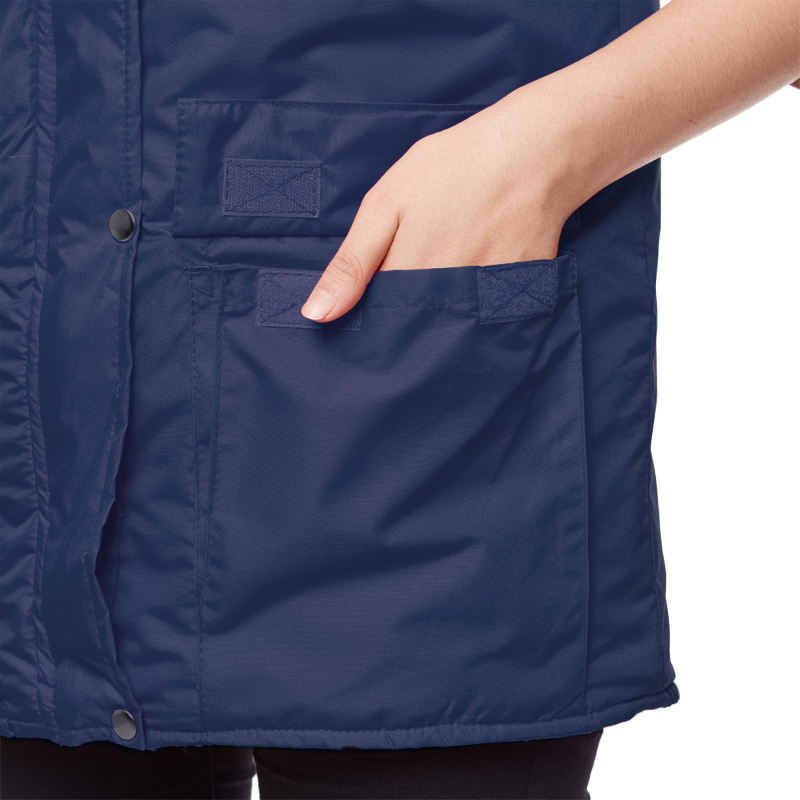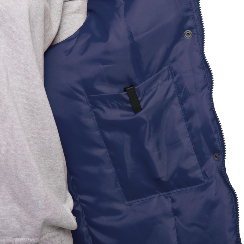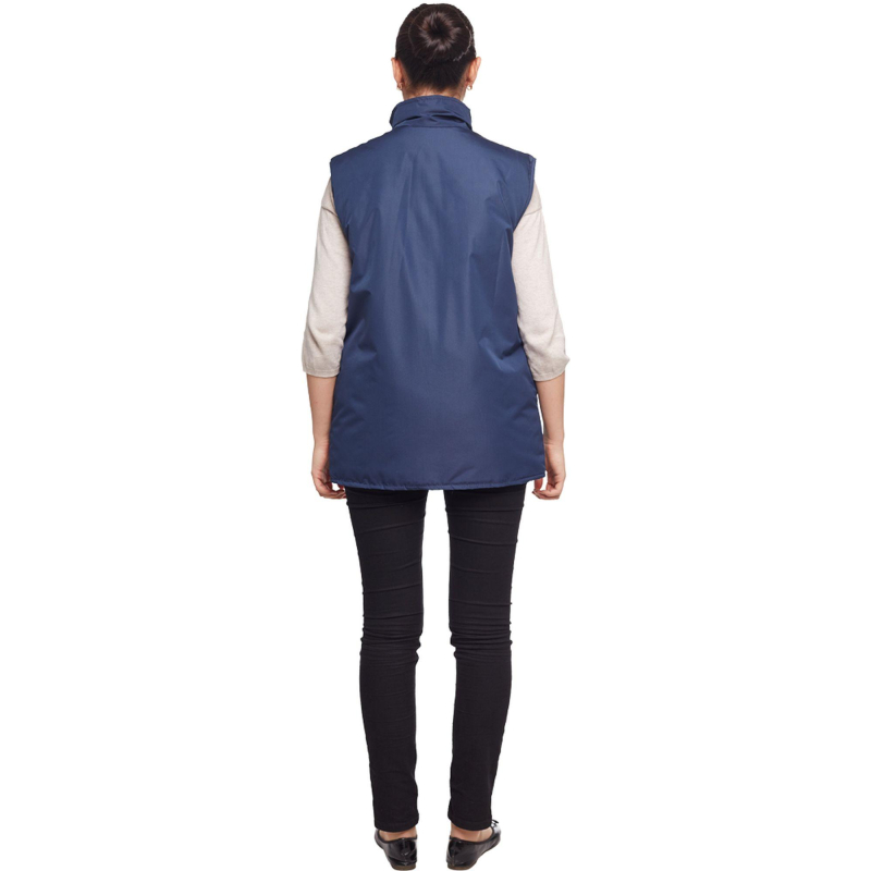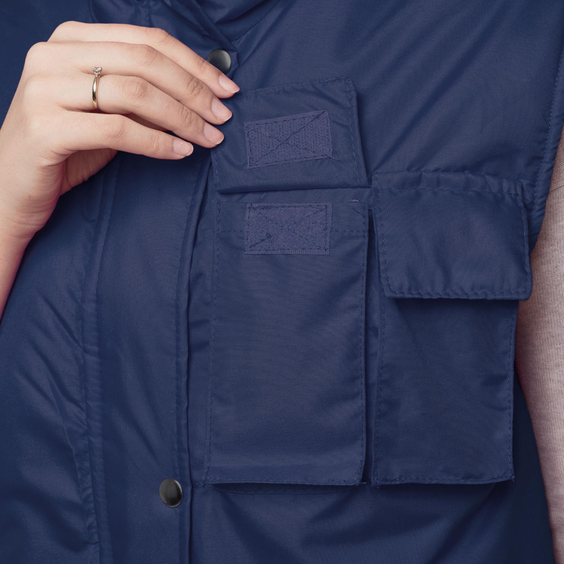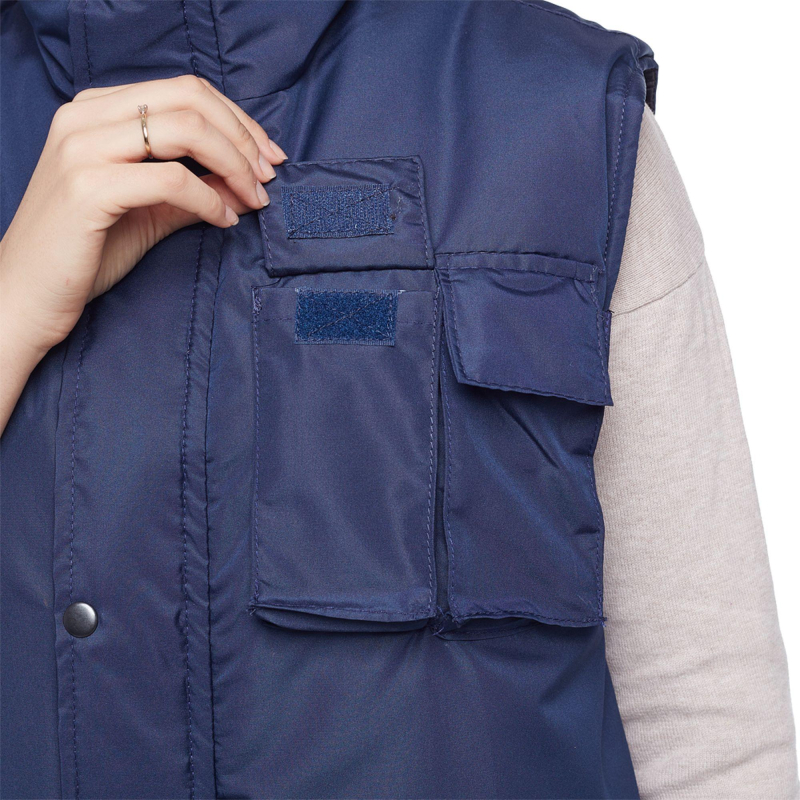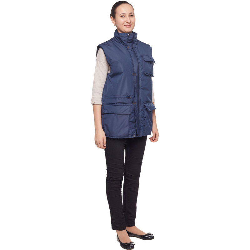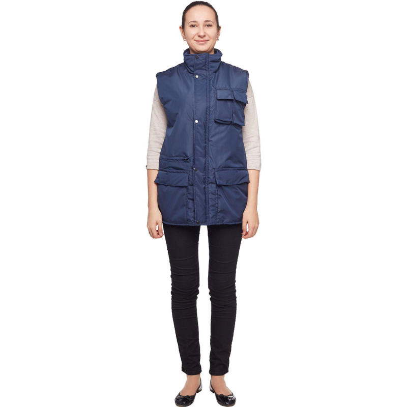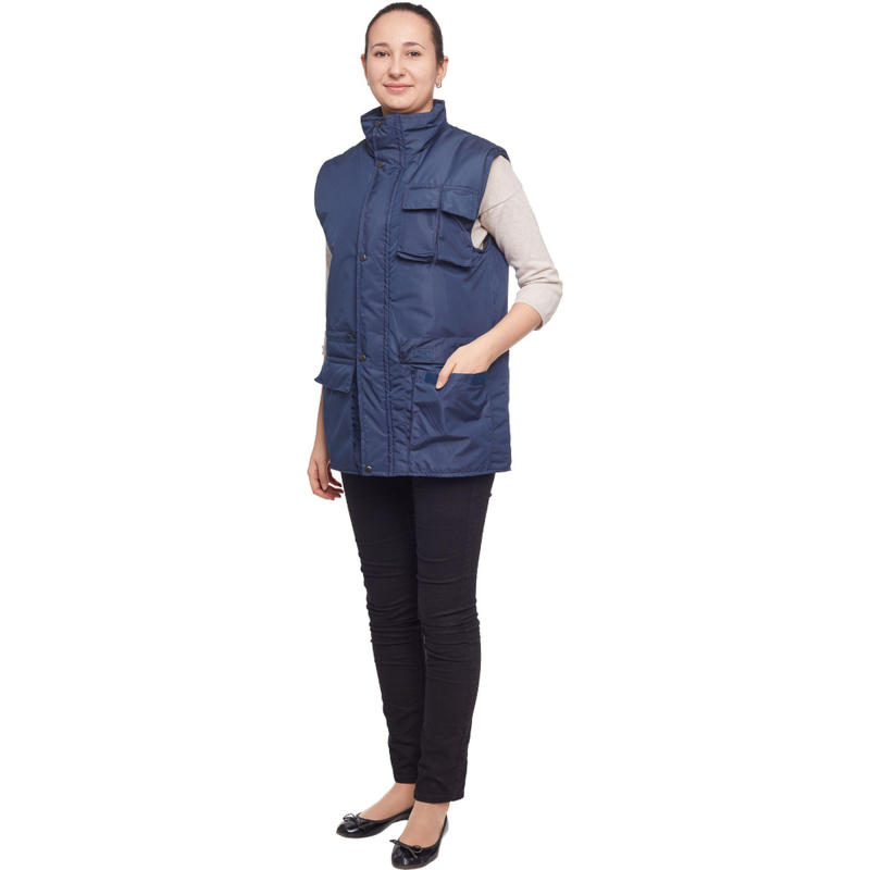 Жилет утепленный ?Товаровед? (размер 48-50, рост 170-176) синий с застежкой на молнию с ветрозащитным клапаном на кнопках. Подходит для работ в прохладных помещениях или на улице. Максимально низкая температура, при которой возможно использование данного жилета, составляет -10 градусов Цельсия. Жилет универсален, он может быть использован в качестве униформы для женщин и для мужчин. Удобные карманы для равномерного распределения необходимых в работе инструментов. Два нагрудных кармана под телефон и другие мелочи. Карман на молнии под листочку. Накладные карманы с клапанами на липучке. Ткань верха: таслан 330D (189 Т) - 100% нейлон. Плотность ткани: 110 г/кв.м. Ткань подкладки: 100% полиэстер. Защищает от общих производственных загрязнений. Утеплитель: синтепон - 240 г/кв.м (2 слоя по 120 к/кв.м). Технология изготовления термоскрепленного синтепона (евросинтепона) позволяет использовать данный утеплитель для создания более тонких изделий с сохранением термозащитных свойств. Важными преимуществами утеплителя являются легкость и хорошая пластичность, что улучшает подвижность в костюме. А также исключение миграции волокна через ткани верха и подкладки за счет скрепления слоев. Цвет на изображении товара в интернет-магазине или в печатном каталоге может отличаться от оригинала из-за особенностей цветопередачи монитора.
