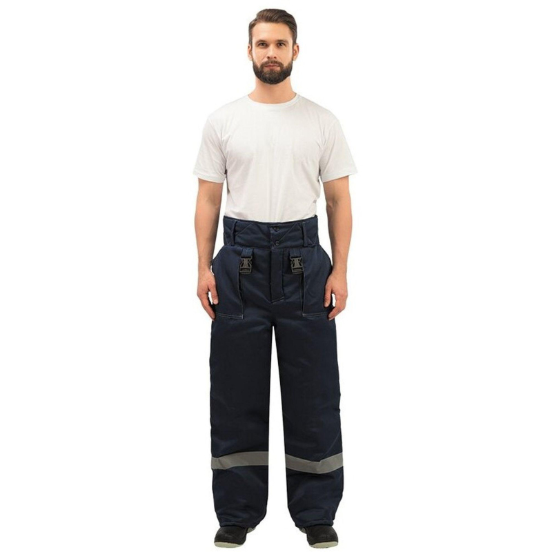 Спецодежда зимняя, брюки мужские модели з32-БР. Выполнены в темно-синем цвете. Размер 64-66, рост 170-176. Изготовлены из смесовой ткани (Тип 3) - 80% полиэстер, 20% хлопок, с водоотталкивающей пропиткой. Плотность ткани 210 г/кв.м. Такой материал обладает улучшенными эксплуатационными характеристиками, благодаря высокой плотности непроницаем для пыли, отличается высокой износостойкостью. Сохраняет яркий цвет. Утеплитель - синтепон, плотностью - 360 г/кв.м (основа) и 240 г/кв.м (ноги). Материал подкладки - 100% полиэстер. Светоотражающая полоса шириной 5 см размещена внизу брюк. Застежка - гульф на три петли-пуговицы. Брюки прямого силуэта, с отрезным поясом. Пояс завышенный, застегивающийся на две петли-пуговицы, с пятью шлевками. Пояс стеганый на бретелях с регулировкой фастексами. Передняя часть брюк: два накладных кармана с косым входом. По низу кармана двойная отсрочка. Задняя часть: по линии талии наличие двух выточек. Нижняя часть брюк обработана швом в подгибку. В брюках припуски боковых, шаговых швов направлены на задние половинки, припуск шва сидения направлен на левую заднюю половинку. Брюки предназначены для защиты работающих от пониженных температур в различных отраслях промышленности, а также производственных загрязнений. Рекомендуется для использования в ЖКХ, озеленении территории, строительстве, проведении ремонтных работ, промышленности, логистике, сельском хозяйстве. Соответствуют стандартам ГОСТ 12.4.303-2016, ТР ТС 019/2011. Коллекция зимней спецодежды з32 представлена в двух видах ткани - смесовая с влагоотталкивающей пропиткой и Оксфорд. К брюкам з32-БР из смесовой ткани подходят куртки з32-КУ из аналогичной ткани, которые в коллекции представлены в двух цветовых решениях: синий с отделкой василькового цвета и синий с отделкой яркого оранжевого цвета. ЗАКОНОДАТЕЛЬНЫЕ И ТЕХНИЧЕСКИЕ ДОКУМЕНТЫ: