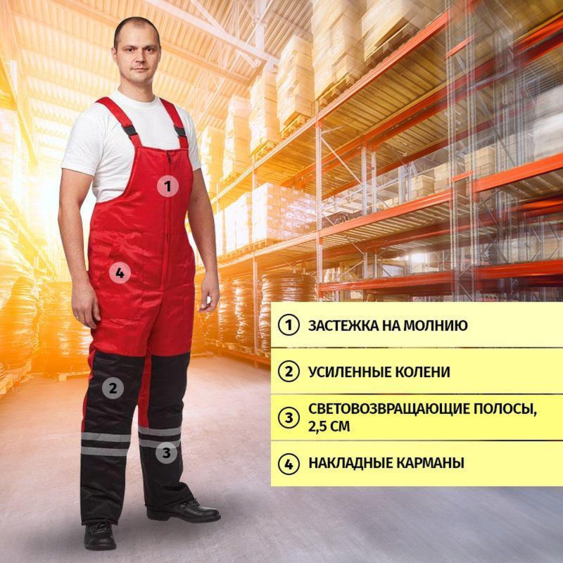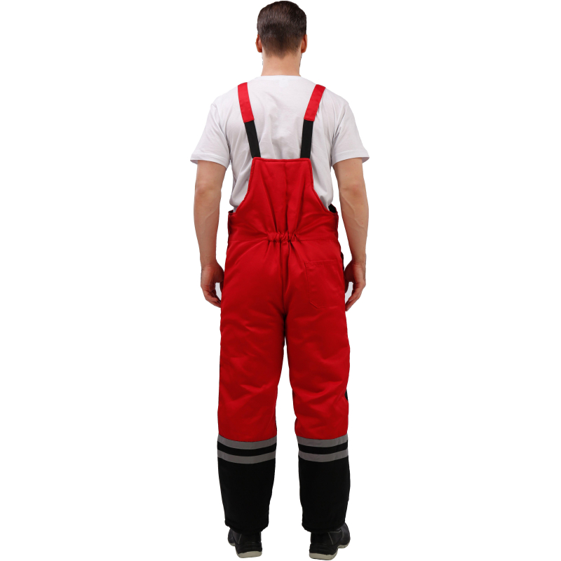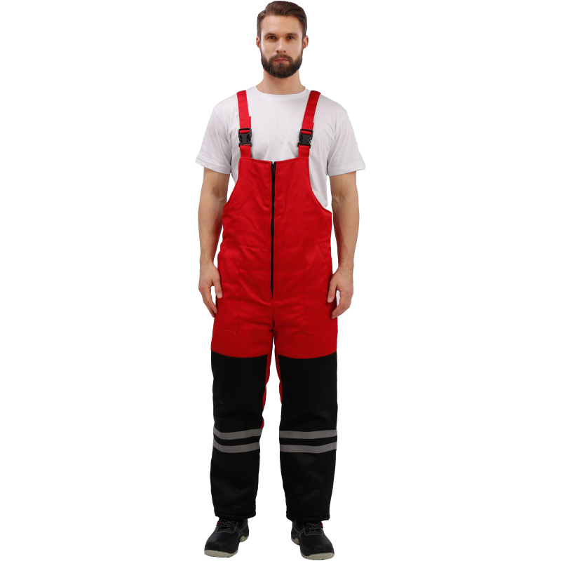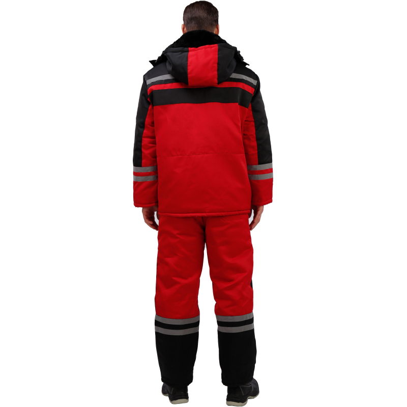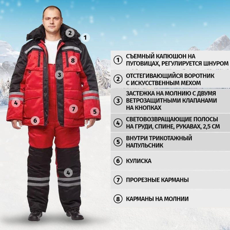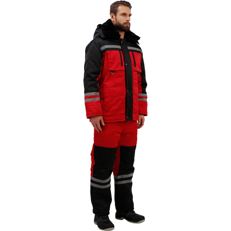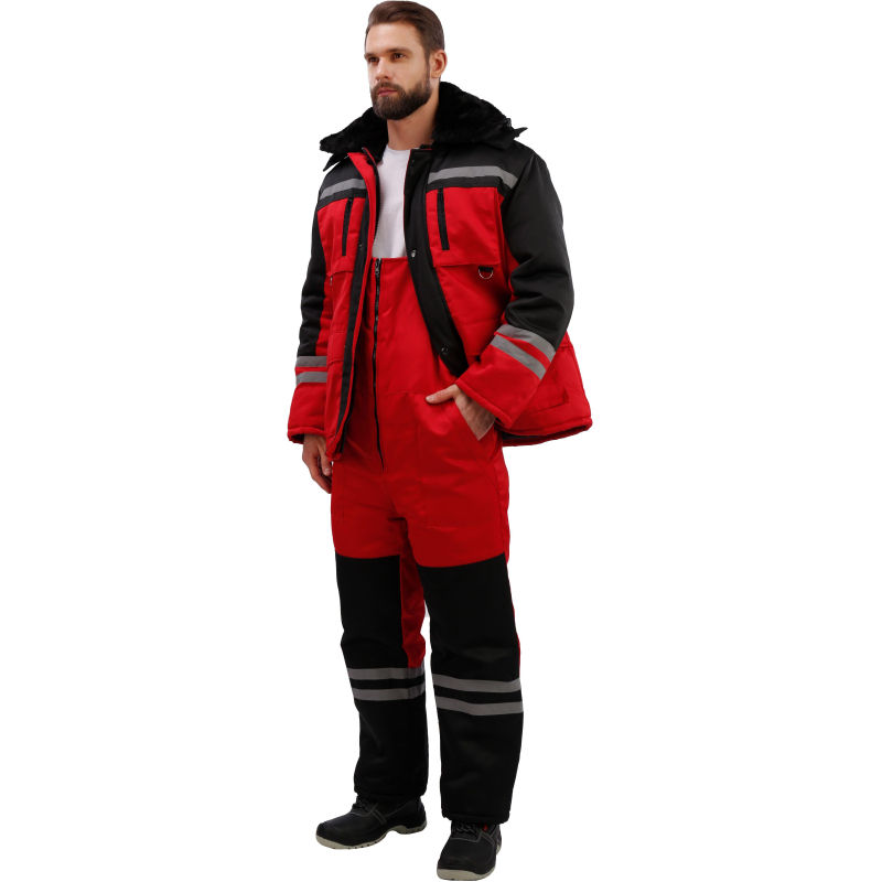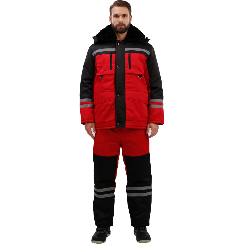 Спецодежда зимняя костюм мужской з03-КПК состоит из куртки и полукомбинезона (размер 56-58, рост 182-188) красного цвета с черными вставками. Изготовлен из смесовой ткани с водоотталкивающей пропиткой (80% полиэстер, 20% хлопок), плотность ткани - 190 г/кв.м. Утеплитель из синтепона, плотностью - 360 г/кв.м (основа) и 240 г/кв.м (руки/ноги). Технология изготовления термоскрепленного синтепона (евросинтепона) позволяет использовать данный утеплитель для создания более тонких изделий с сохранением термозащитных свойств. Важными преимуществами утеплителя являются легкость и хорошая пластичность, что улучшает подвижность в костюме. А также исключение миграции волокна через ткани верха и подкладки за счет скрепления слоев. Материал подкладки - 100% полиэстер. Светоотражающая полоса размещена на груди, спине, рукавах, а также внизу полукомбинезона. Куртка с центральной застежкой на молнию, двумя ветрозащитными клапанами, съемным утепленным капюшоном, нижними прорезными и верхними накладными карманами. Полукомбинезон классического покроя с усилением в области колен и молниями по низу боковых швов. Костюм обеспечивает защиту от пониженных температур и производственных загрязнений. ГОСТ 12. 4. 303-2016. Законодательные и технические документы