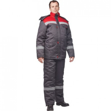 Спецодежда зимняя костюм мужской з31-КПК состоит из куртки и полукомбинезона (размер 56-58, рост 170-176). Изготовлен из смесовой ткани (65% полиэстер, 35% хлопок), плотность ткани - 210 г/кв.м. Утеплитель - синтепон, плотностью - 360 г/кв.м (основа) и 240 г/кв.м (руки/ноги). Технология изготовления термоскрепленного синтепона (евросинтепона) позволяет использовать данный утеплитель для создания более тонких изделий с сохранением термозащитных свойств. Важными преимуществами утеплителя являются легкость и хорошая пластичность, что улучшает подвижность в костюме. А также исключение миграции волокна через ткани верха и подкладки за счет скрепления слоев. Материал подкладки - 100% полиэстер. Данная модель костюма предназначена для носки при температуре до -18°C. Светоотражающая полоса размещена на груди, спине, рукавах, а также внизу полукомбинезона. Куртка с центральной застежкой на молнию, ветрозащитным клапаном, съемным капюшоном, имеет два нижних внутренних кармана и один верхний накладной, трикотажные напульсники. Полукомбинезон классического покроя с центральной молнией, с двумя нижними накладными карманами. Костюм обеспечивает защиту от пониженных температур и производственных загрязнений. Стандарты: ГОСТ 12.4.303-2016. Костюмы, состоящие из куртки и полукомбинезона, из коллекции зимней спецодежды з31 представлены в нескольких цветовых сочетаниях: серый с контрастной отделкой красного цвета и синий, с аналогичной красной отделкой.