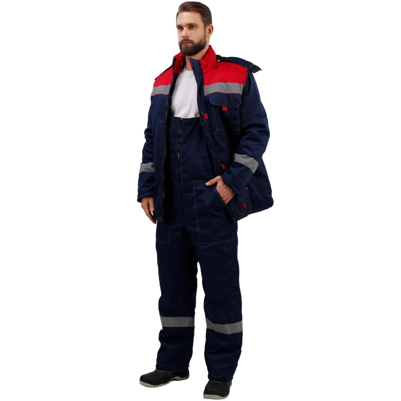 Спецодежда зимняя костюм мужской з31-КПК состоит из куртки и полукомбинезона (размер 48-50, рост 170-176) . Изготовлен из смесовой ткани (65% полиэстер, 35% хлопок), плотность ткани - 210 г/кв.м. Утеплитель - синтепон, плотностью - 360 г/кв.м (основа) и 240 г/кв.м (руки/ноги). Технология изготовления термоскрепленного синтепона (евросинтепона) позволяет использовать данный утеплитель для создания более тонких изделий с сохранением термозащитных свойств. Важными преимуществами утеплителя являются легкость и хорошая пластичность, что улучшает подвижность в костюме. А также исключение миграции волокна через ткани верха и подкладки за счет скрепления слоев. Материал подкладки - 100% полиэстер. Данная модель костюма предназначена для носки при температуре до -18°C. Светоотражающая полоса размещена на груди, спине, рукавах, а также внизу полукомбинезона. Куртка с центральной застежкой на молнию, ветрозащитным клапаном, съемным капюшоном, имеет два нижних внутренних кармана и один верхний накладной, трикотажные напульсники. Полукомбинезон классического покроя с центральной молнией, с двумя нижними накладными карманами. Костюм обеспечивает защиту от пониженных температур и производственных загрязнений. Стандарты: ГОСТ 12.4.303-2016. Костюмы, состоящие из куртки и полукомбинезона, из коллекции зимней спецодежды з31 представлены в нескольких цветовых сочетаниях: серый с контрастной отделкой красного цвета и синий, с аналогичной красной отделкой.