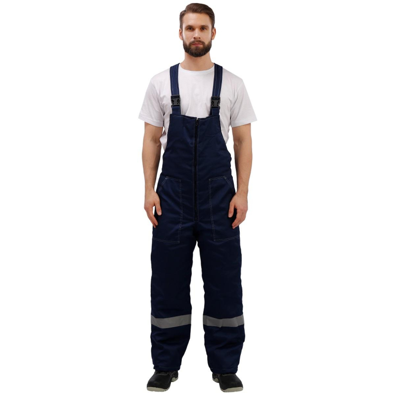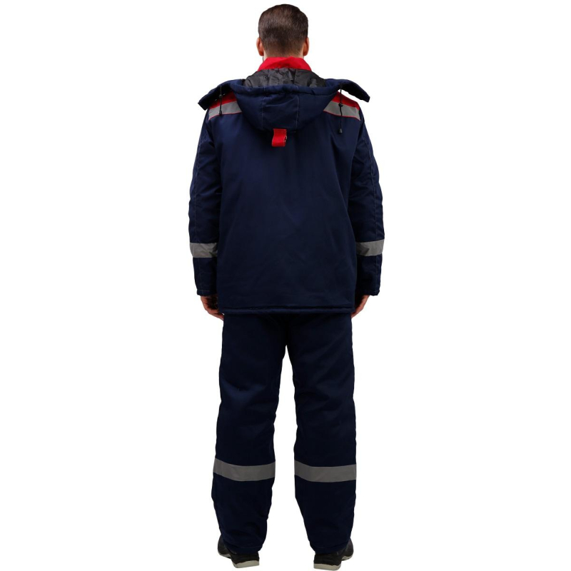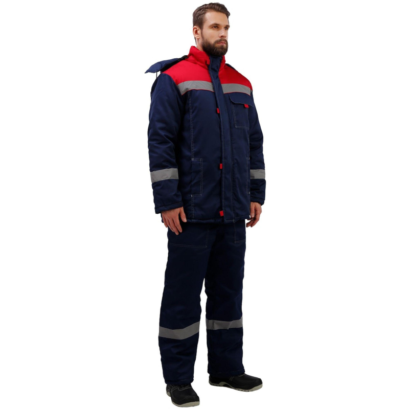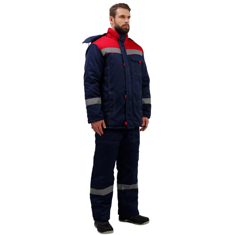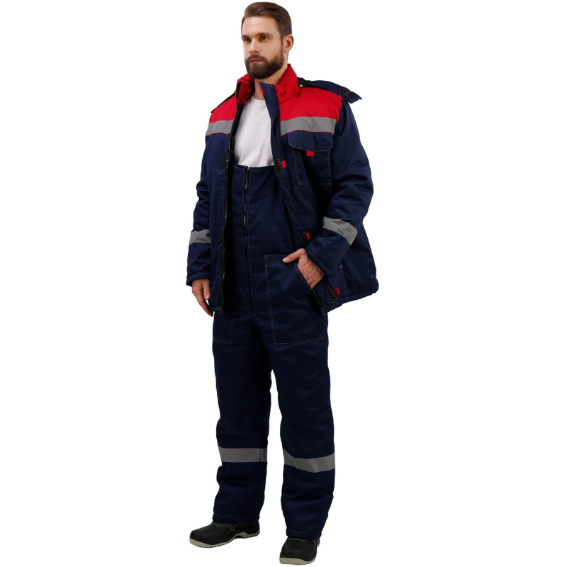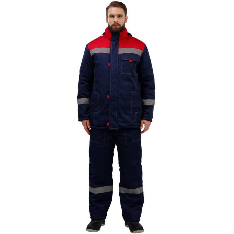 Спецодежда зимняя костюм мужской з31-КПК состоит из куртки и полукомбинезона (размер 64-66, рост 170-176) синего цвета с красными вставками и контрастной отстрочкой. Изготовлен из смесовой ткани (65% полиэстер, 35% хлопок), плотность ткани - 210 г/кв.м. Утеплитель - синтепон, плотностью - 360 г/кв.м (основа) и 240 г/кв.м (руки/ноги). Материал подкладки - 100% полиэстер. Данная модель костюма предназначена для носки при температуре до -18°C. Светоотражающая полоса размещена на груди, спине, рукавах, а также внизу полукомбинезона. Куртка с центральной застежкой на молнию, ветрозащитным клапаном, съемным капюшоном, имеет два нижних внутренних кармана и один верхний накладной, трикотажные напульсники. Полукомбинезон классического покроя с центральной молнией, с двумя нижними накладными карманами. Костюм обеспечивает защиту от пониженных температур и производственных загрязнений. Стандарты: ГОСТ 12.4.303-2016. Костюмы, состоящие из куртки и полукомбинезона, из коллекции зимней спецодежды з31 представлены в нескольких цветовых сочетаниях: серый с контрастной отделкой красного цвета и синий, с аналогичной красной отделкой.