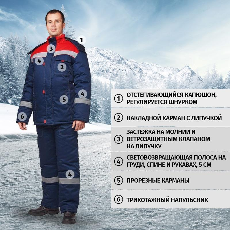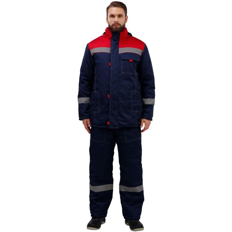 Спецодежда зимняя костюм мужской з31-КПК состоит из куртки и полукомбинезона (размер 64-66, рост 182-188) синего цвета с красными вставками и контрастной отстрочкой. Изготовлен из смесовой ткани (65% полиэстер, 35% хлопок), плотность ткани - 210 г/кв.м. Утеплитель - синтепон, плотностью - 360 г/кв.м (основа) и 240 г/кв.м (руки/ноги). Материал подкладки - 100% полиэстер. Данная модель костюма предназначена для носки при температуре до -18°C. Светоотражающая полоса размещена на груди, спине, рукавах, а также внизу полукомбинезона. Куртка с центральной застежкой на молнию, ветрозащитным клапаном, съемным капюшоном, имеет два нижних внутренних кармана и один верхний накладной, трикотажные напульсники. Полукомбинезон классического покроя с центральной молнией, с двумя нижними накладными карманами. Костюм обеспечивает защиту от пониженных температур и производственных загрязнений. Стандарты: ГОСТ 12.4.303-2016. Костюмы, состоящие из куртки и полукомбинезона, из коллекции зимней спецодежды з31 представлены в нескольких цветовых сочетаниях: серый с контрастной отделкой красного цвета и синий, с аналогичной красной отделкой.