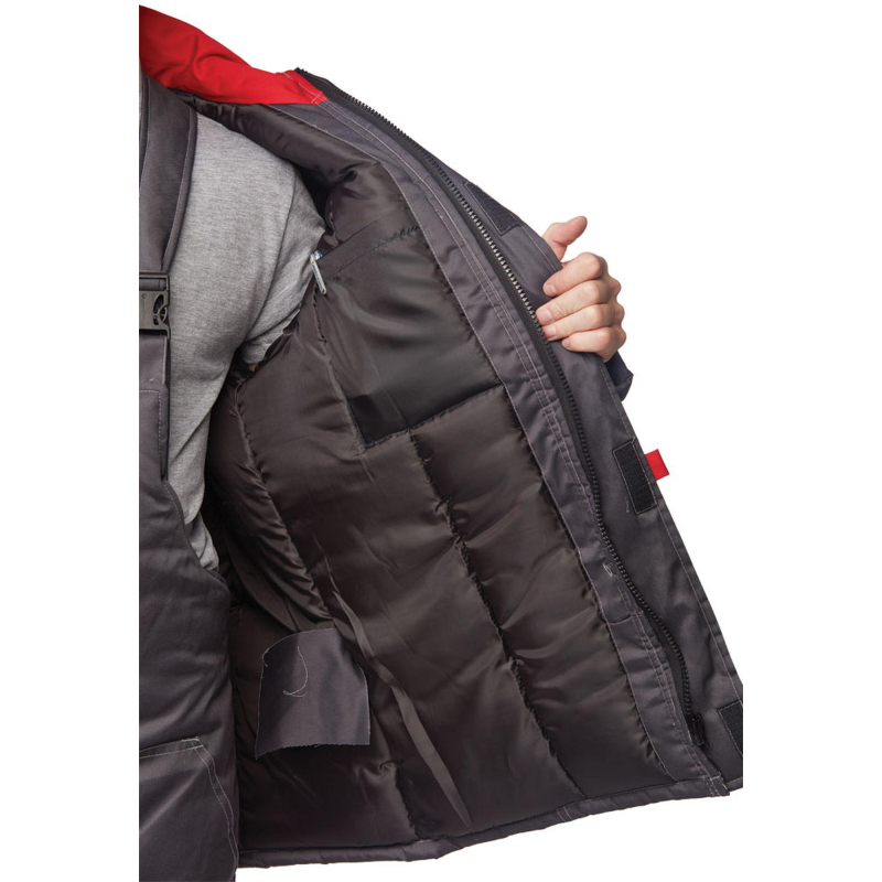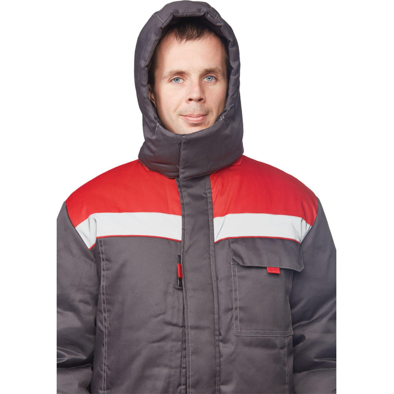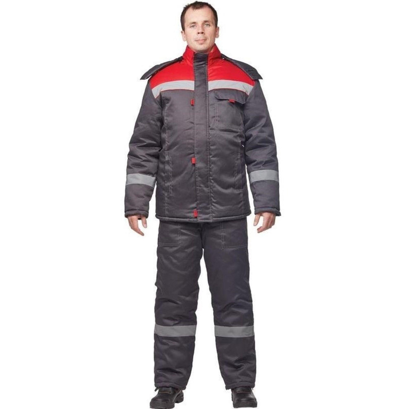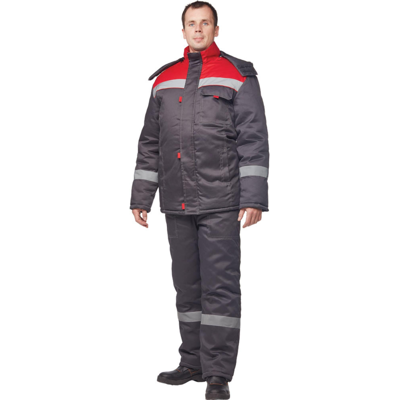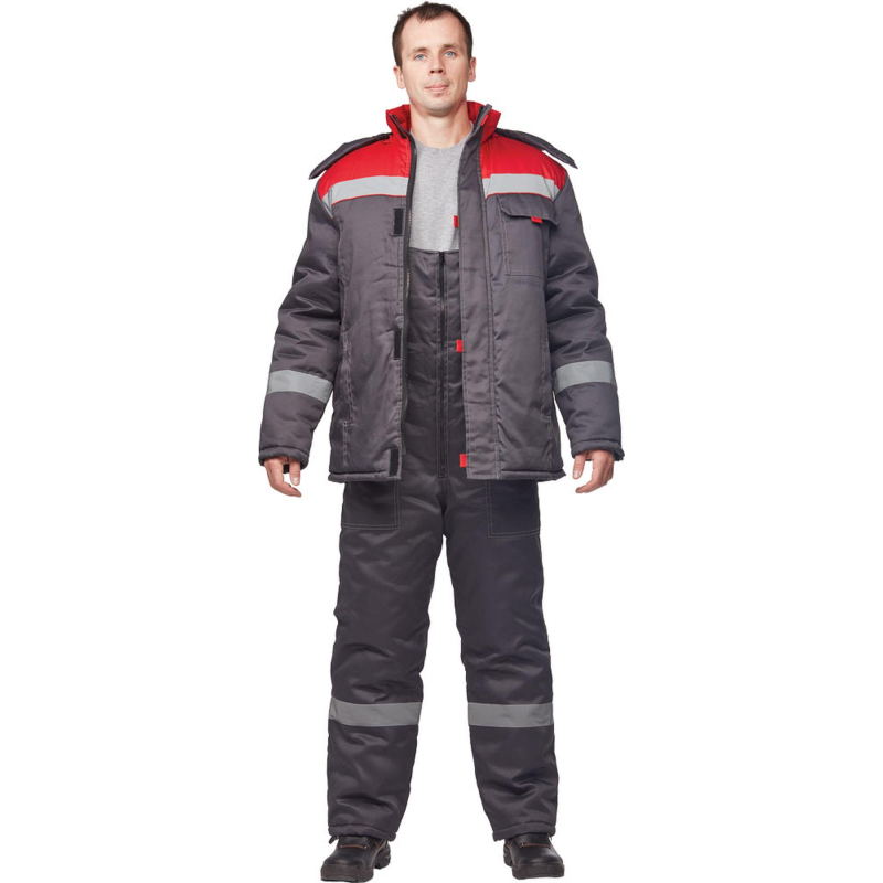 Спецодежда зимняя костюм мужской з31-КПК состоит из куртки и полукомбинезона (размер 48-50, рост 158-164) серого цвета с красными вставками и контрастной отстрочкой. Изготовлен из смесовой ткани (65% полиэстер, 35% хлопок), плотность ткани - 210 г/кв.м. Утеплитель - синтепон, плотностью - 360 г/кв.м (основа) и 240 г/кв.м (руки/ноги). Материал подкладки - 100% полиэстер. Данная модель костюма предназначена для носки при температуре до -18°C. Светоотражающая полоса размещена на груди, спине, рукавах, а также внизу полукомбинезона. Куртка с центральной застежкой на молнию, ветрозащитным клапаном, съемным капюшоном, имеет два нижних внутренних кармана и один верхний накладной, трикотажные напульсники. Полукомбинезон классического покроя с центральной молнией, с двумя нижними накладными карманами. Костюм обеспечивает защиту от пониженных температур и производственных загрязнений. Стандарты: ГОСТ 12.4.303-2016. Костюмы, состоящие из куртки и полукомбинезона, из коллекции зимней спецодежды з31 представлены в нескольких цветовых сочетаниях: серый с контрастной отделкой красного цвета и синий, с аналогичной красной отделкой.