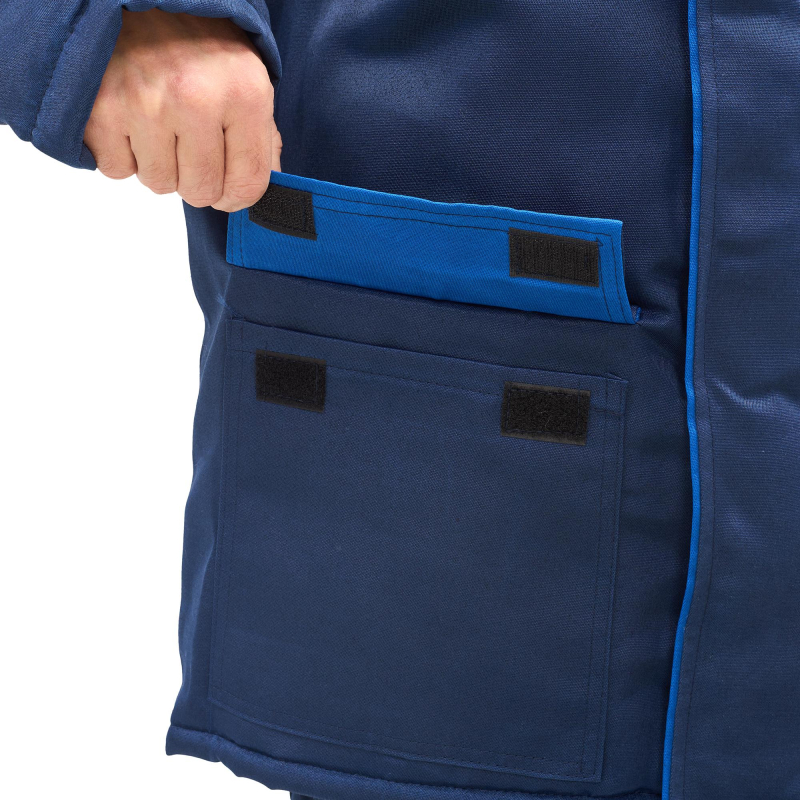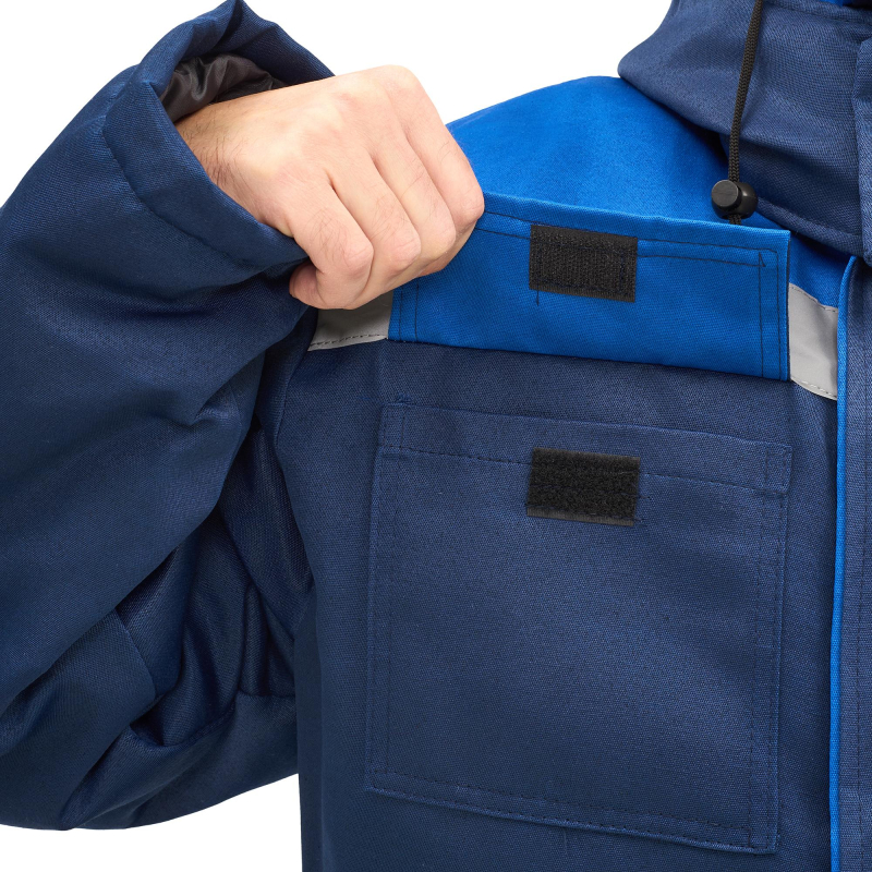 Спецодежда зимняя костюм мужской з12-КПК с СОП состоит из куртки и полукомбинезона (размер 48-50, рост 170-176). Изготовлен из смесовой ткани Грета с водоотталкивающей пропиткой (80% полиэфир, 20% хлопок, плотность 190г/м2). Утеплитель из синтепона, плотностью - 360 г/кв.м (основа) и 240 г/кв.м (руки/ноги). Технология изготовления термоскрепленного синтепона (евросинтепона) позволяет использовать данный утеплитель для создания более тонких изделий с сохранением термозащитных свойств. Важными преимуществами утеплителя являются легкость и хорошая пластичность, что улучшает подвижность в костюме. А также исключение миграции волокна через ткани верха и подкладки за счет скрепления слоев. Материал подкладки - 100% полиэстер. Куртка застегивается на молнию и контактную ленту, оснащена отстегивающимся регулируемым капюшоном и напульсниками, а также имеет нагрудные и боковые накладные карманы с клапанами и внутренний карман. Полукомбинезон классического покроя с усилением в области колен и боковыми карманами, застегивается на молнию. Наличие СОП ленты 50 мм на куртке проходит по спине, груди, на п/к по низу.Костюм обеспечивает защиту от пониженных температур и производственных загрязнений. ГОСТ 12. 4. 303-2016