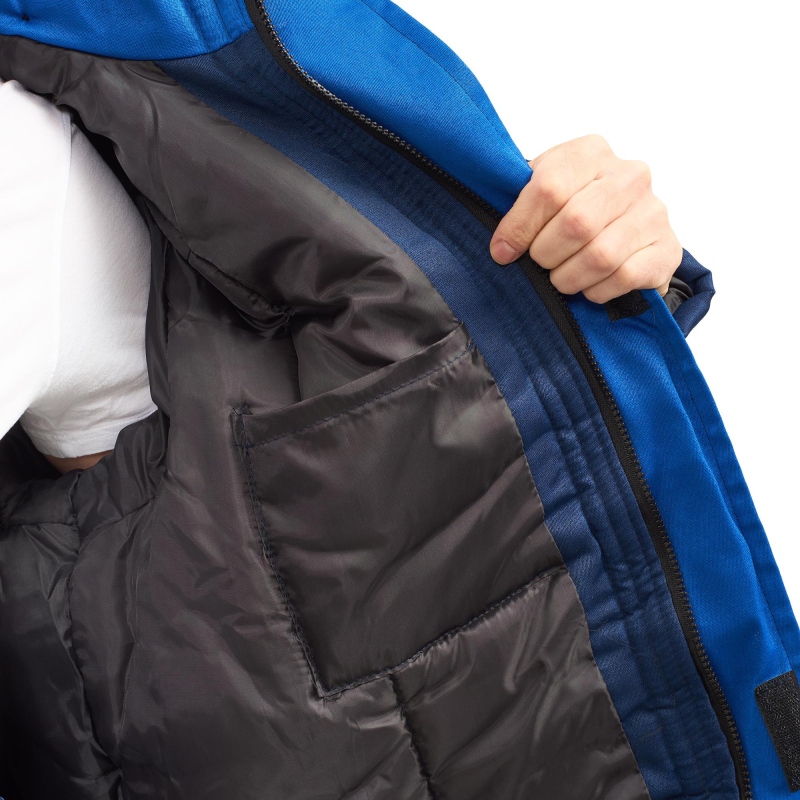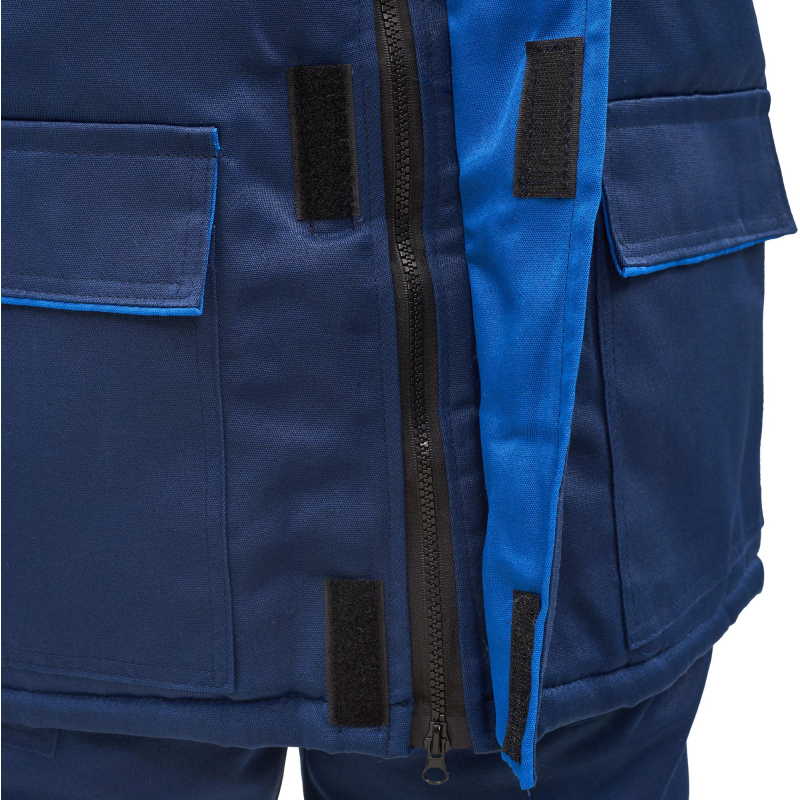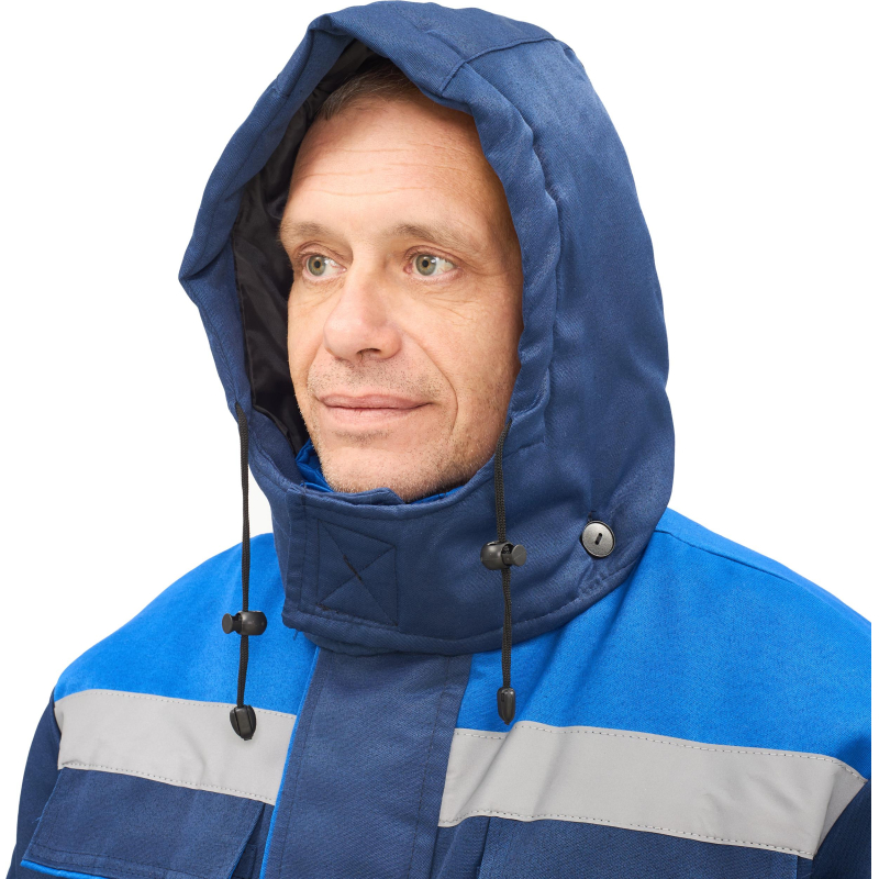 Спецодежда зимняя костюм мужской з12-КПК с СОП состоит из куртки и полукомбинезона (размер 52-54, рост 170-176) синего цвета с васильковыми вставками. Изготовлен из смесовой ткани Грета с водоотталкивающей пропиткой (80% полиэфир, 20% хлопок, плотность 190г/м2). Утеплитель из синтепона, плотностью - 360 г/кв.м (основа) и 240 г/кв.м (руки/ноги). Материал подкладки - 100% полиэстер. Куртка застегивается на молнию и контактную ленту, оснащена отстегивающимся регулируемым капюшоном и напульсниками, а также имеет нагрудные и боковые накладные карманы с клапанами и внутренний карман. Полукомбинезон классического покроя с усилением в области колен и боковыми карманами, застегивается на молнию. Наличие СОП ленты 50 мм на куртке проходит по спине, груди, на п/к по низу.Костюм обеспечивает защиту от пониженных температур и производственных загрязнений. ГОСТ 12. 4. 303-2016
