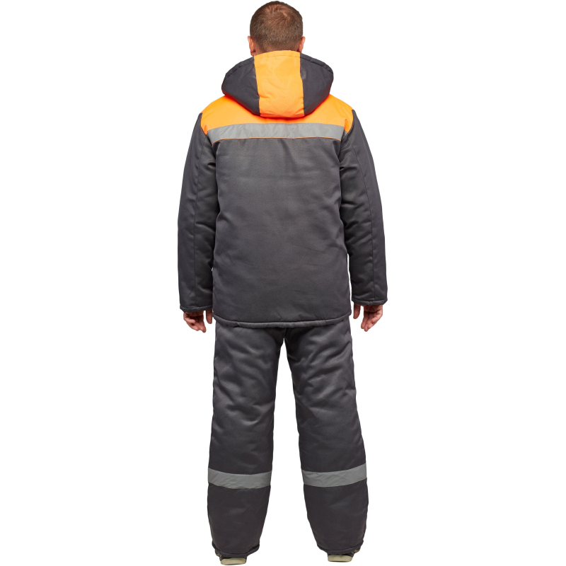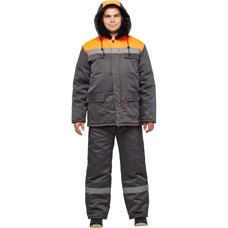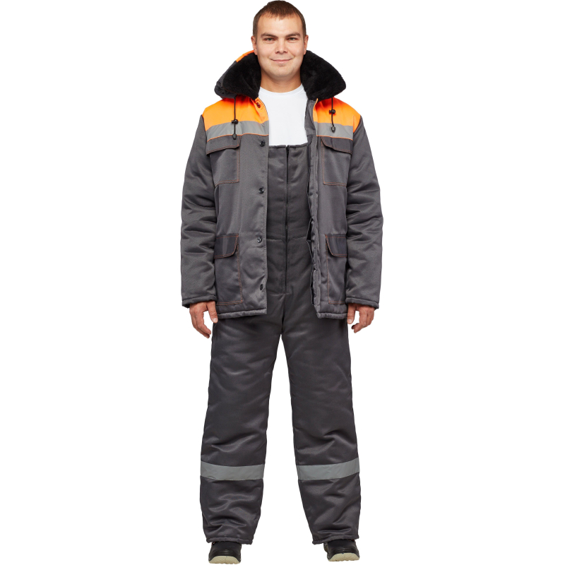 Костюм рабочий зимний мужской з35-КПК. Размер: 64-66. Рост: 158-164. Предназначен для защиты работающих от пониженных температур в различных отраслях промышленности, а также производственных загрязнений. Костюм состоит из куртки и полукомбинезон. Состав ткани: 80 % полиэстер, 20 % хлопок. Ткань с водоотталкивающей пропиткой/отделкой. Плотность ткани: 210 г/кв.м. Утеплитель: синтепон, плотностью - 360 г/кв.м (основа) и 240 г/кв.м (руки/ноги). Технология изготовления термоскрепленного синтепона (евросинтепона) позволяет использовать данный утеплитель для создания более тонких изделий с сохранением термозащитных свойств. Важными преимуществами утеплителя являются легкость и хорошая пластичность, что улучшает подвижность в костюме. А также исключение миграции волокна через ткани верха и подкладки за счет скрепления слоев. Куртка прямого силуэта, удлиненная, с центральной супатной застежкой на 5 петель-пуговиц. Со съемным капюшоном, пристегивающийся на 3 петли-пуговицы и регулирующийся кулиской и двумя двухдырчатыми фиксаторами. Меховой воротник. Кокетка оранжевого цвета и наличие СОП ленты 5 см. Наличие двух нагрудных и двух нижних накладных карманов с клапанами. Карманы отстрочены двойной контрастной строчкой. Наличие трикотажного манжета. Нижняя часть обработана швом в подгибку. Полукомбинезон прямого силуэта с центральной застежкой на молнию. Два кармана с косым входом, по линии талии располагается резинка. Бретели регулируются при помощи пряжек фастексов. Коллекция зимней спецодежды з35 представлена комплектами з35-КПК. Относится к сегменту ?Эконом?. Соответствует базовым характеристикам, заявленному ГОСТ и ТР ТС. Длительность эксплуатации СИЗ зависит от правильного ношения, хранения, условий работы и норм выдачи, установленных в организации и на предприятии. ЗАКОНОДАТЕЛЬНЫЕ И ТЕХНИЧЕСКИЕ ДОКУМЕНТЫ: