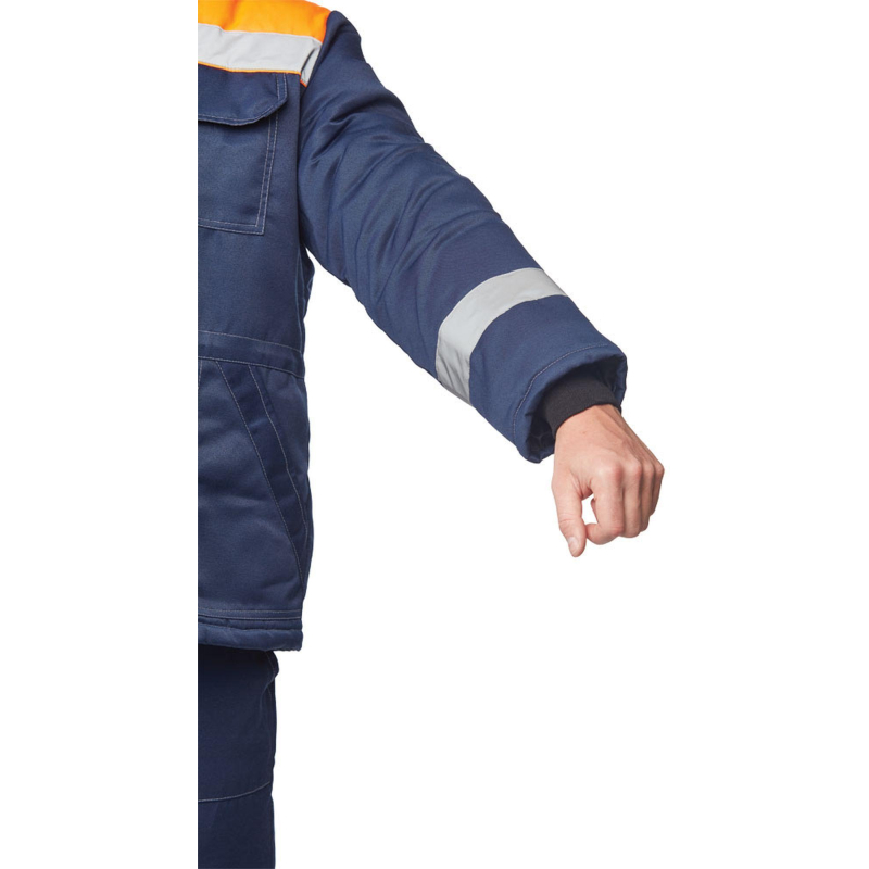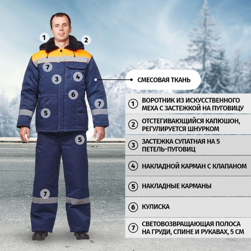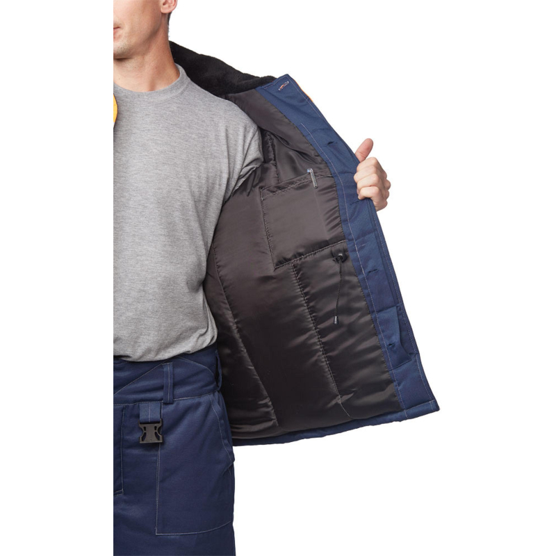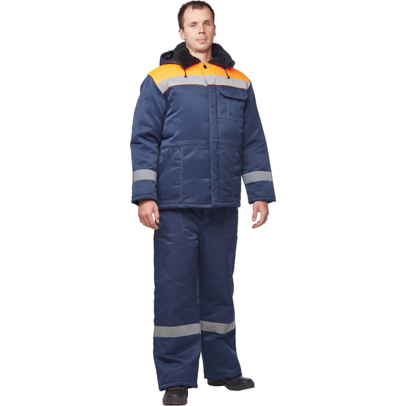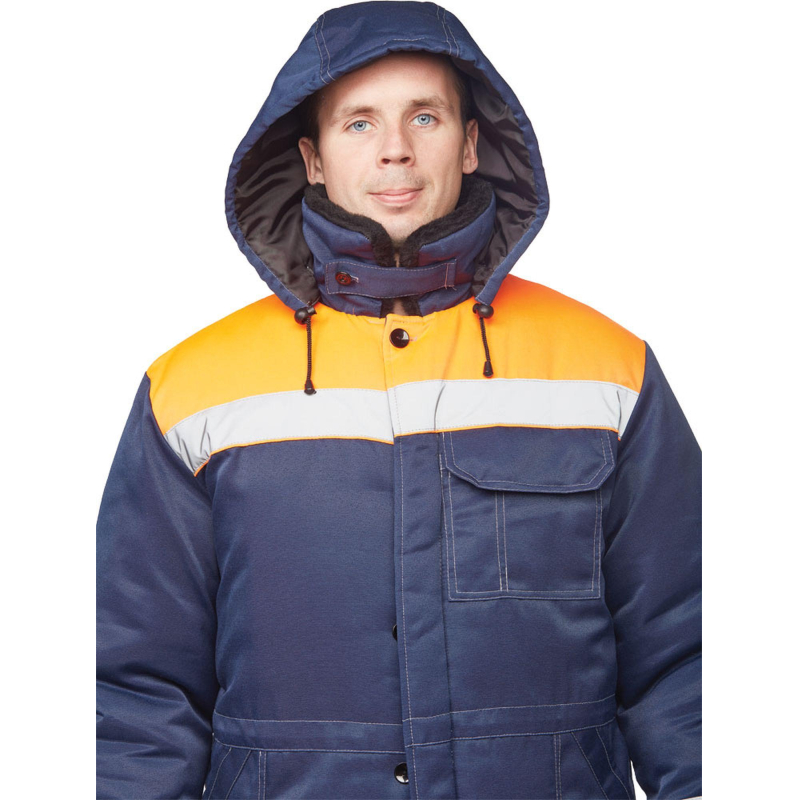 Спецодежда зимняя куртка мужская з32-КУ (размер 68-70, рост 182-188). Изготовлена из смесовой ткани (Тип 3) (80% полиэстер, 20% хлопок) плотностью 210 г/кв. м., с водоотталкивающей пропиткой. Такой материал обладает улучшенными эксплуатационными характеристиками, благодаря высокой плотности непроницаем для пыли, отличается высокой износостойкостью. Сохраняет яркий цвет. Утеплитель - синтепон, плотностью - 360 г/кв.м (основа) и 240 г/кв.м (руки). Технология изготовления термоскрепленного синтепона (евросинтепона) позволяет использовать данный утеплитель для создания более тонких изделий с сохранением термозащитных свойств. Важными преимуществами утеплителя являются легкость и хорошая пластичность, что улучшает подвижность в костюме. А также исключение миграции волокна через ткани верха и подкладки за счет скрепления слоев. Материал подкладки - 100% полиэстер. Светоотражающая полоса шириной 5 см размещена спереди и сзади между кокеткой и нижней частью куртки. Куртка прямого силуэта, удлиненная, с центральной бортовой супатной застежкой на 5 петель-пуговиц. Полочка отрезная по линии кокетки. Наличие двух нижних накладных карманов с косым срезом и наличие одного накладного нагрудного кармана с клапаном с двойной контрастной отстрочкой. Низ куртки обработан швом в подгибку с закрытым срезом. По линии талии настрочена кулиса со сквозным выходом наизнанку, регулируется шаровым фиксатором и шнуром. Спинка прямая, отрезная по линии кокетки. Рукав прямой, втачной, одношовный. Внутри рукава по нижней части на подкладку притачан трикотажный манжет. Воротник меховой, спереди застегивающийся на пуговицу. Капюшон отстегивается. Куртка предназначена для защиты работающих от пониженных температур в различных отраслях промышленности, а также производственных загрязнений. Изготавливается в соответствии с ГОСТ 12. 4. 303-2016. Рекомендуется для использования в ЖКХ, озеленении территории, строительстве, проведении ремонтных работ, промышленности, логистике, сельском хозяйстве. Коллекция зимней спецодежды з32 представлена в двух видах ткани - смесовая с влагоотталкивающей пропиткой и Оксфорд. К куртке з32-КУ из смесовой ткани подходят брюки з32-БР из аналогичной ткани. ЗАКОНОДАТЕЛЬНЫЕ И ТЕХНИЧЕСКИЕ ДОКУМЕНТЫ: