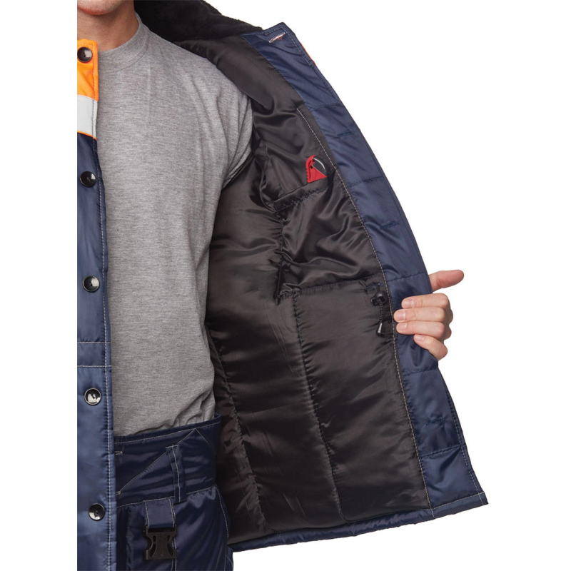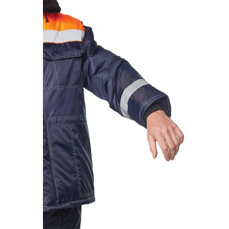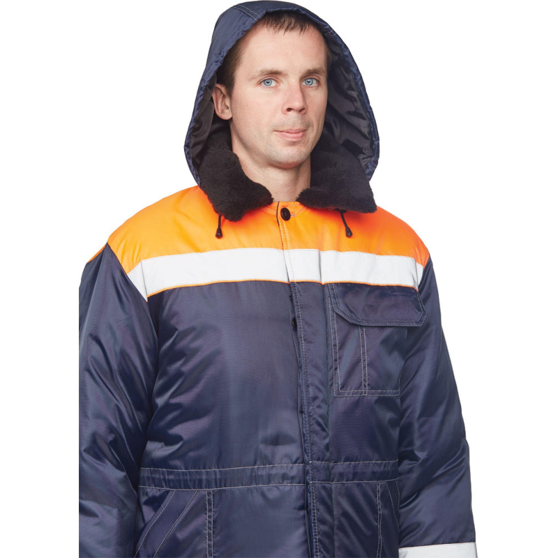 Спецодежда зимняя куртка мужская з32-КУ (размер 56-58, рост 182-188). Изготовлена из материала Оксфорд (100% полиэстер) плотностью 90 +/- 5 г/кв.м. Утеплитель - синтепон, плотностью - 360 г/кв.м (основа) и 240 г/кв.м (руки). Технология изготовления термоскрепленного синтепона (евросинтепона) позволяет использовать данный утеплитель для создания более тонких изделий с сохранением термозащитных свойств. Важными преимуществами утеплителя являются легкость и хорошая пластичность, что улучшает подвижность в костюме. А также исключение миграции волокна через ткани верха и подкладки за счет скрепления слоев. Материал подкладки - 100% полиэстер. Светоотражающая полоса шириной 5 см размещена спереди и сзади между кокеткой и нижней частью куртки. Куртка прямого силуэта, удлиненная, с центральной бортовой супатной застежкой на 5 петель-пуговиц. Полочка отрезная по линии кокетки. Наличие двух нижних накладных карманов с косым срезом и наличие одного накладного нагрудного кармана с клапаном с двойной контрастной отстрочкой. Низ куртки обработан швом в подгибку с закрытым срезом. По линии талии настрочена кулиса со сквозным выходом наизнанку, регулируется шаровым фиксатором и шнуром. Спинка прямая, отрезная по линии кокетки. Рукав прямой, втачной, одношовный. Внутри рукава по нижней части на подкладку притачан трикотажный манжет. Воротник меховой, спереди застегивающийся на пуговицу. Куртка предназначена для защиты работающих от пониженных температур в различных отраслях промышленности (сельское хозяйство логистика, легкая промышленность, строительство), а также производственных загрязнений. Изготавливается в соответствии с ГОСТ 12. 4. 303-2016. Коллекция зимней спецодежды з32 представлена в двух видах ткани - смесовая с влагоотталкивающей пропиткой и Оксфорд. К куртке з32-КУ из ткани Оксфорд подходят брюки з32-БР из аналогичной ткани. ЗАКОНОДАТЕЛЬНЫЕ И ТЕХНИЧЕСКИЕ ДОКУМЕНТЫ: