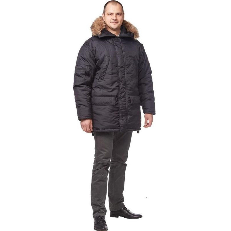 Спецодежда зимняя куртка мужская 'Аляска' (размер 44-46, рост 170-176). Изготовлена из ткани 'Оксфорд' (100% полиэстер), плотность ткани - 110 г/кв.м. Утеплитель - синтепон, плотность - 200 г/кв.м (2 слоя). Материал подкладки - 100% полиэстер. Куртка удлиненная с центральной застежкой на молнию, ветрозащитным клапаном, два нижних накладных и два потайных верхних плюс внутренний карман, низ куртки регулируется кулиской, капюшон с искусственным мехом (не отстегивается). Куртка обеспечивает защиту от пониженных температур и производственных загрязнений. Рекомендована для использования в сельском хозяйстве, логистике, легкой промышленности, строительстве. ГОСТ 12.4.303-2016.