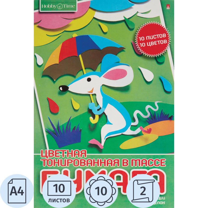 Десять листов формата А4 десяти разных цветов тонированы в массе. Благодаря такой технологии лист окрашен и на поверхности, и на сгибе/срезе. Плотность бумаги 80 г/кв.м. Двустронняя. Сохранность листов, вырезанных деталей, заготовок обеспечивает картонная папка плотностью 235 г/кв.м. Обложки с забавным мышонком и мультяшными китами послужат источником вдохновения для создания красивых поделок своими руками. В набор цветной бумаги входят следующие цвета: флюоресцентный розовый, ярко-голубой, желтый, красный, оранжевый, серый, ярко-зеленый, черный, фиолетовый, коричневый. Товар поставляется в нескольких вариантах дизайна (без возможности выбора).