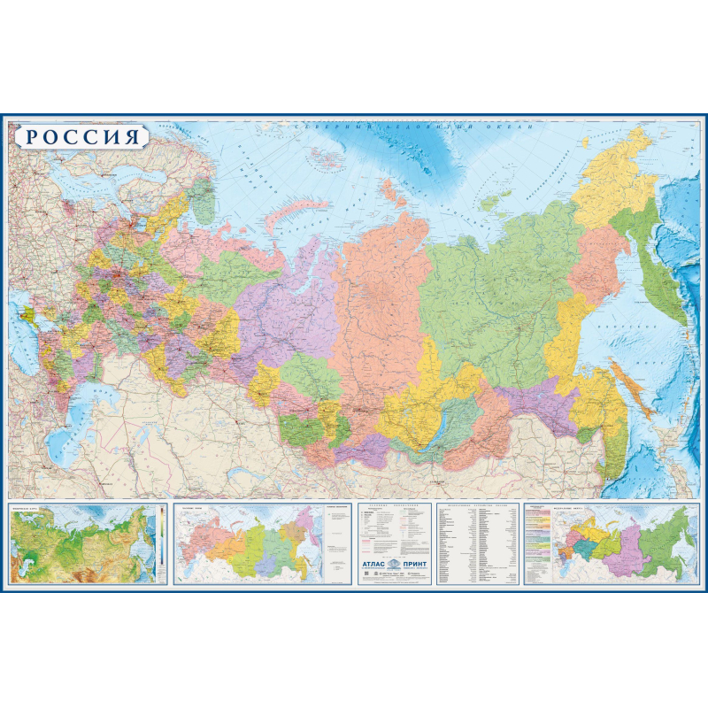 Настенная политико-административная карта России. Формат 2330х1580 мм. Мелованная бумага с ламинированием. Качественная полиграфия. Цветом выделены все субъекты Российской Федерации, подписаны их названия и центры. Цветным фоном показан рельеф суши и морского дна. Показаны и подписаны населенные пункты, порты и аэропорты, автомобильные и железнодорожные магистрали. Даны карты-врезки федеральных округов, часовых зон и физической карты РФ. Масштаб карты 1:3 700 000.