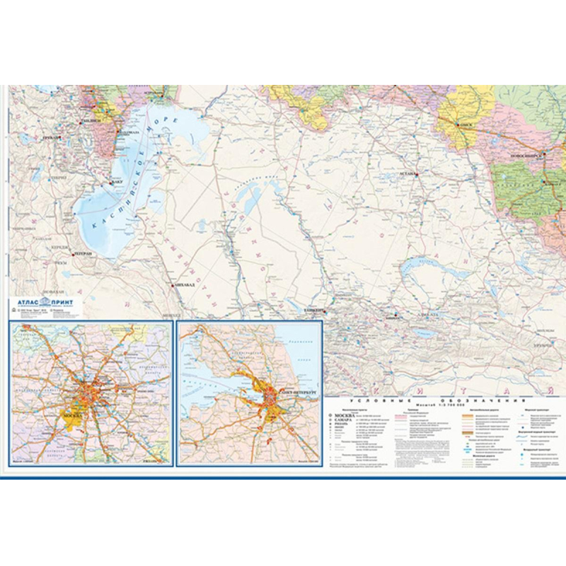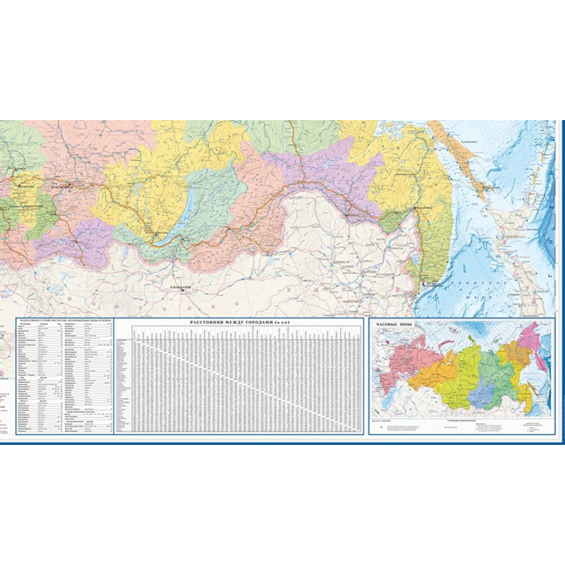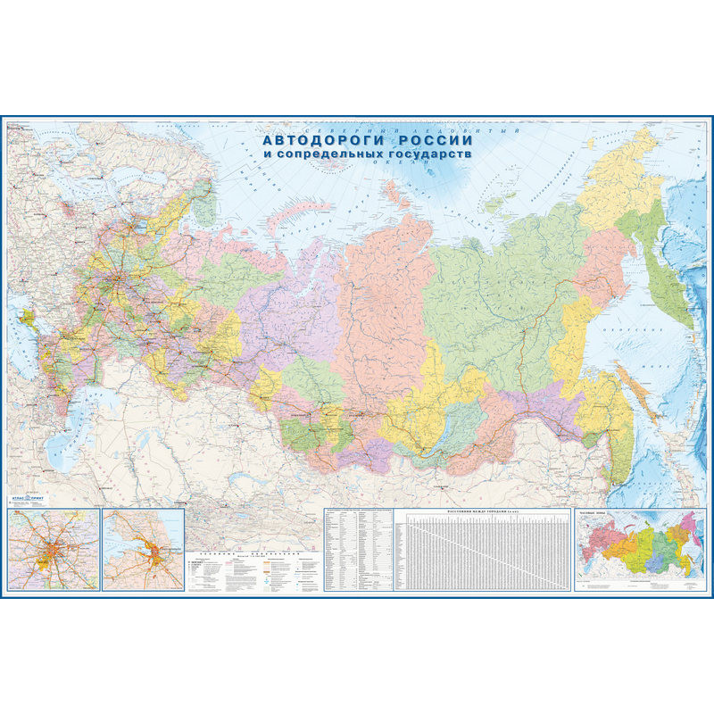 Настенная карта России "Автодороги России и сопредельных государств". Формат 2330х1580 мм. Отдельно даны часовые зоны России, таблица расстояний между городами, автомобильные коды регионов. Год издания 2022.