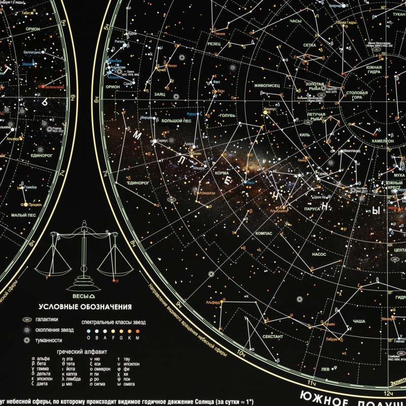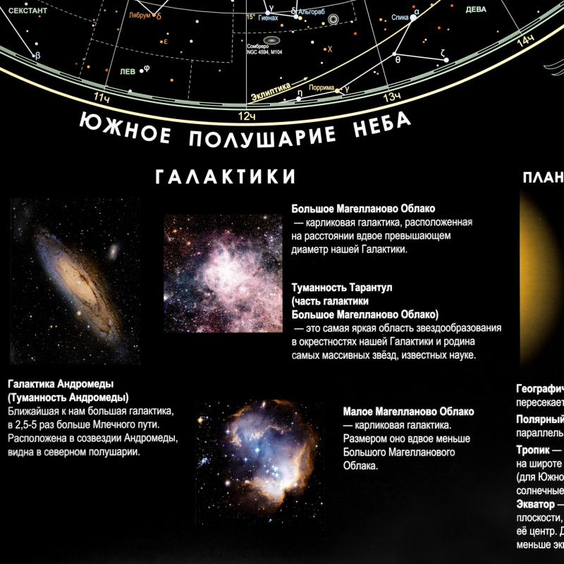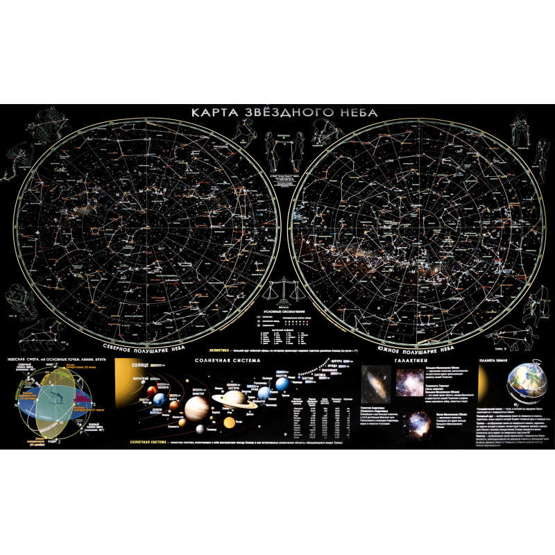 Показаны Северное и Южное полушария, даны подробные сведения о планете Земля и других планетах Солнечной Системы, художественные изображения зодиакальных созвездий.