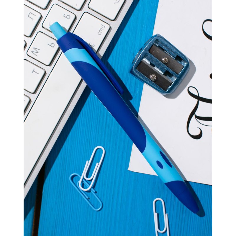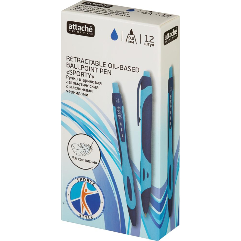 Ручка шариковая автоматическая Attache Selection Sporty - яркий дизайн и прекрасное качество! Модель ручки снабжена кнопочным механизмом, изготовлена из прорезиненного пластикового корпуса голубого цвета с синими вставками. Диаметр ручки - 11 мм, длина ручки 145 мм. Сменный стержень длиной 107 мм с стандартным наконечником, заправлен высококачественными масляными чернилами синего цвета. Эргономичная форма ручки способствует правильному положению пальцев во время письма, а прорезиненный корпус препятствует выскальзыванию. Диаметр пишущего узла 0,7 мм создает тонкую линию письма, равную 0,5 мм. Ручка шариковая автоматическая Attache Selection Sporty - это уникальное сочетание стиля, надежности и удобства!