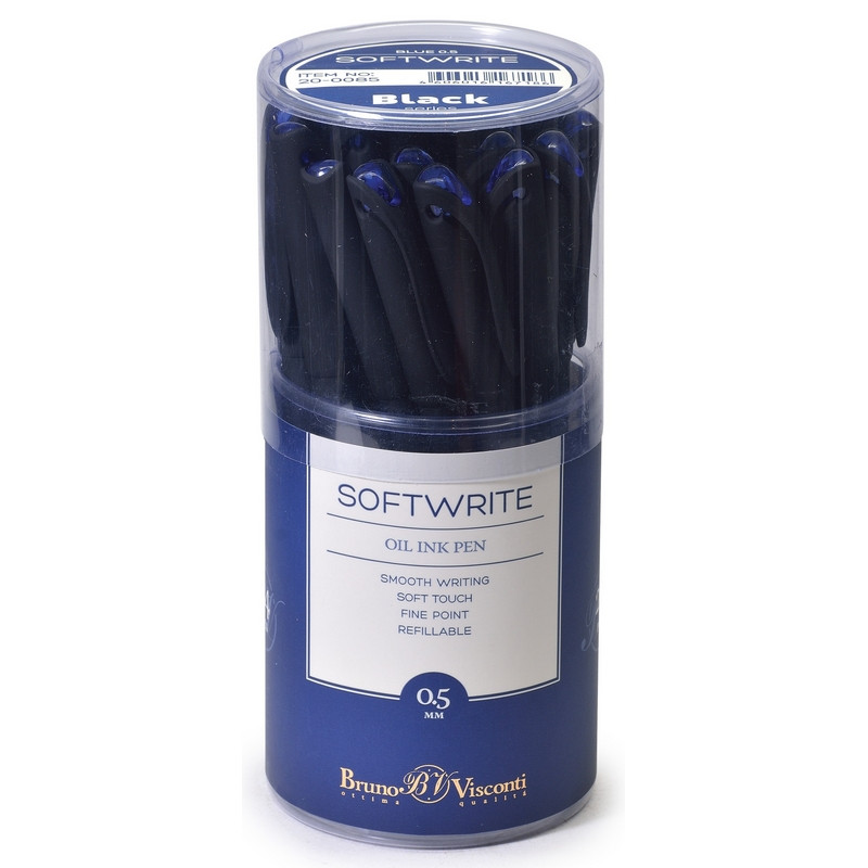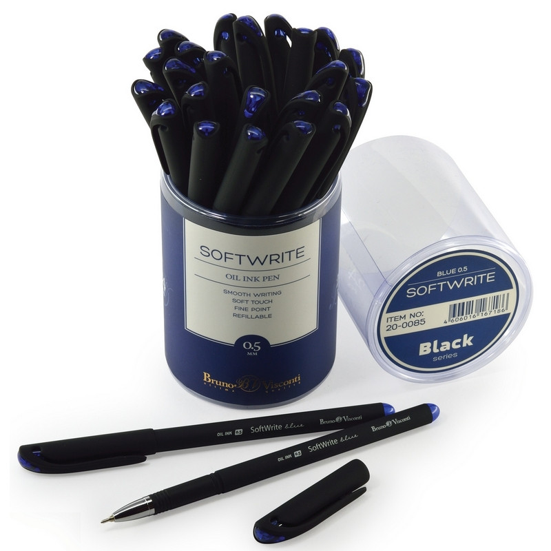Ручка шариковая Bruno Visconti SoftWrite Black. Простой и надежный пишущий механизм выполнен из высококачественных материалов. Округлый корпус черного цвета выполнен из качественного пластика. Сменный стержень с пигментными чернилами Dokumental (Германия) синего цвета. Текстурированное покрытие c эффектом silk-touch передает приятные ощущения при письме, снижая скольжение. Пишущий узел Premec (Швейцария) с толщиной 0,5 мм закреплен в корпусе при помощи металлического наконечника полуигольчатой формы. Производство: Китай.
