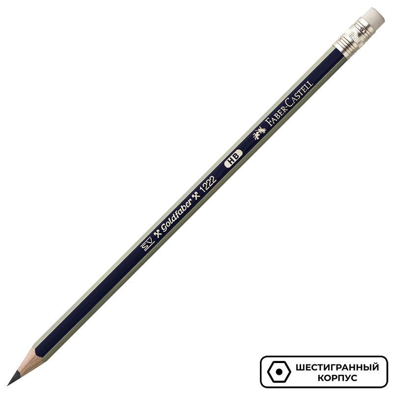 Карандаш чернографитный Faber-Castell Goldfaber в шестигранном деревянном корпусе. Твердость грифеля НВ. Простые карандаши с ластиком поставляются заточенными.