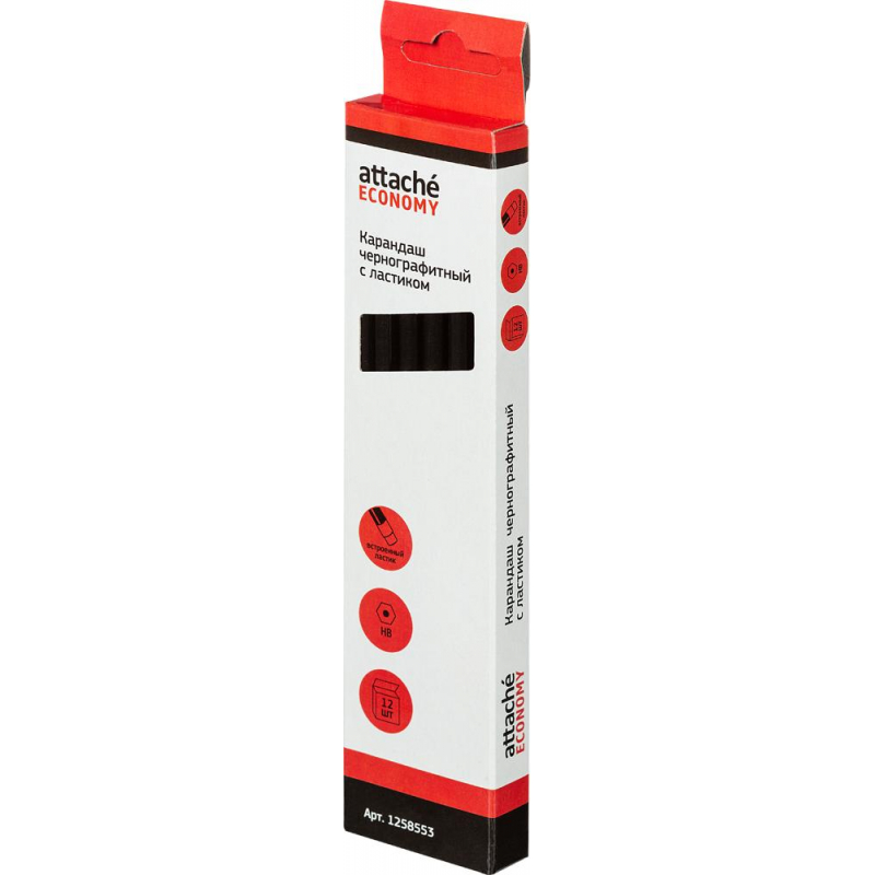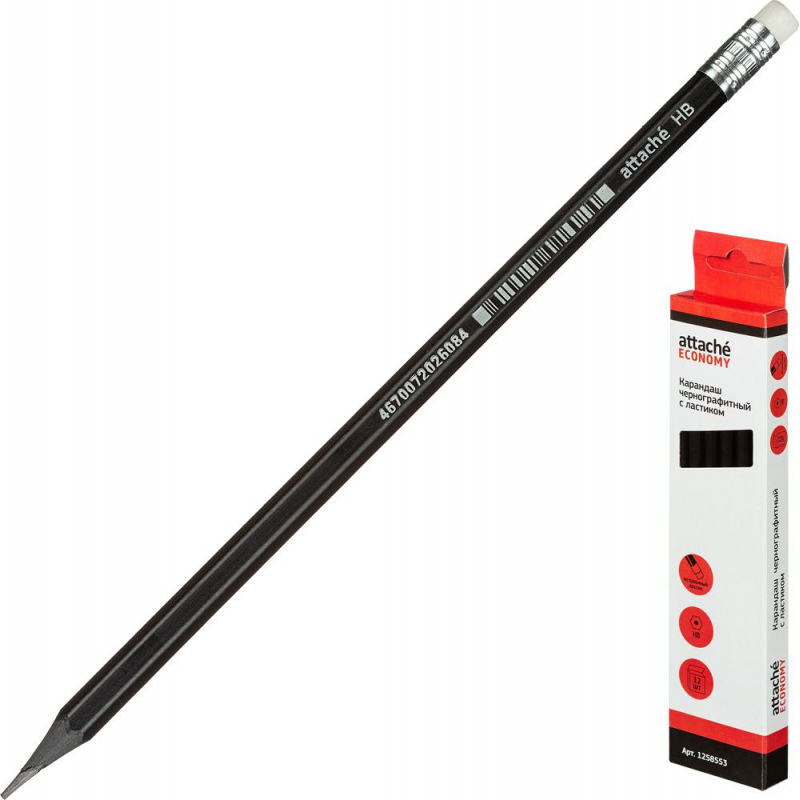 Карандаш чернографитный Attache Economy подходит для выполнения проектно-конструкторских работ, позволяет сделать легкий набросок, быстрый стремительный рисунок или нарисовать полноценную картину. Шестигранный корпус карандаша изготовлен из пластика, оснащен ластиком. Карандаш легко точится и не крошится. Поставляется заточенным. Твердость грифеля - НB. Цвет корпуса - черный. Товар относится к ценовому сегменту "суперэконом". Имеет упрощенные характеристики и более простую упаковку. Отвечает основным требованиям потребления.