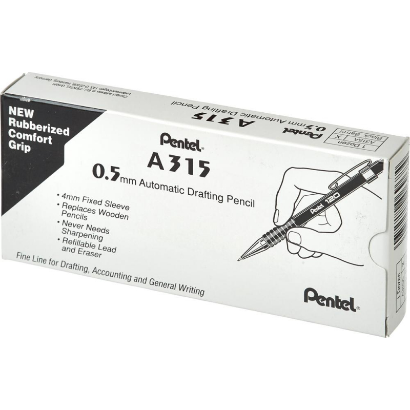 Автоматический карандаш Pentel А315-AX относится к серии профессиональных карандашей. Выполнен в черном пластиковом корпусе с металлическим клипом и снабжен ластиком. Выступающий цанговый зажим гарантирует прочный захват грифеля. Оставляет равномерный мягкий след толщиной 0,5 мм. Имеет металлический игольчатый наконечник. В комплекте поставляются два грифеля твердости НВ. Длина корпуса - 140 мм, диаметр - 8 мм. Сменный стержень для автоматического карандаша вы сможете найти во вкладке 'Расходные материалы'. Страна-производитель - Япония.