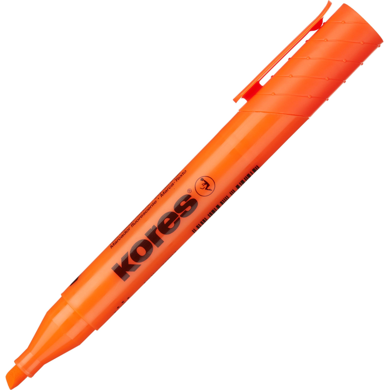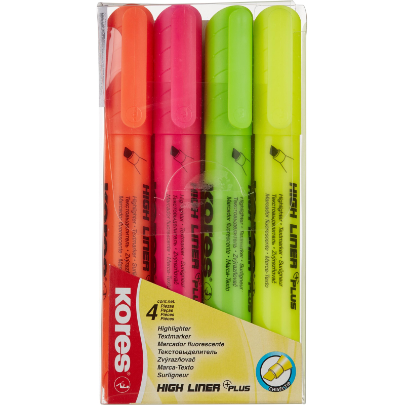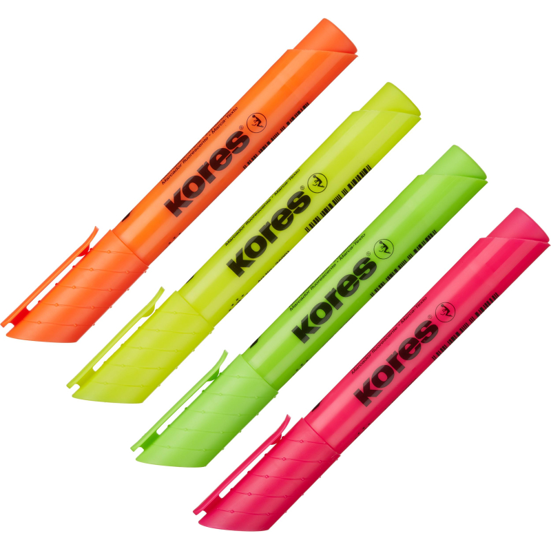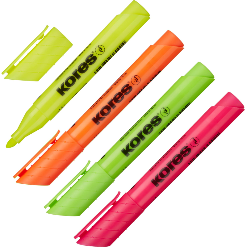Набор текстовыделителей Kores набор 36040. Высококачественные текстовыделители со скошенным наконечником, обладают оригинальным дизайном корпуса, колпачком с клипом. В наборе 4 ярких флуоресцентных цвета: желтый, розовый, оранжевый, зеленый. Универсальные чернила на водной основе подходят для всех видов бумаги, в том числе для ксерокопия, факсов и документов, распечатанных на струйных принтерах. Увеличенный запас чернил обеспечивает более длительный срок службы. Цвет корпуса и колпачка соответствует цвету чернил. Чернила светоустойчивые. Ширина линии письма: 1-5мм. Произведено в Чешской Республике. Снятый колпачок не потеряется благодаря тому, что во время работы его можно надевать на верхнюю часть маркера.