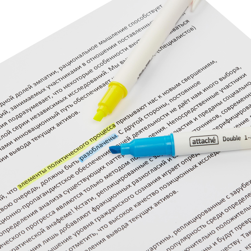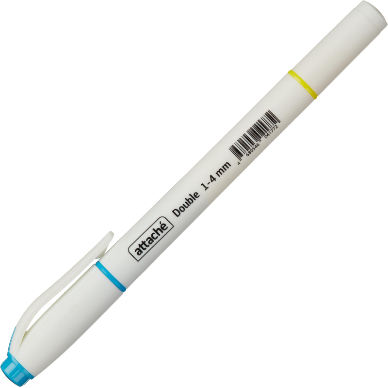 Текстовыделитель двусторонний Attache Double желтый и голубой - это отличный выбор для любителей рисования маркерами. Выгодное решение - 2 цвета в одном маркере.Текстовыделитель поможет выделять самое важное в документах или просто тексте, и Вы сможете обработать и не забыть больше полезной информации. Помимо стильного дизайна данный текстовыделитель отличает безупречное качество. Текстовыделитель обладает экономным расходом чернил. Светоустойчивые чернила на водной основе не выцветают даже на открытом солнце и не размазываются в процессе. Чернила не промокают бумагу. Текстовыделитель имеет чернила на водной основе желтого и голубого цвета. Чернила не имеют запах. Маркер обладает круглой формой корпуса. Колпачок снабжен специальным клипом, с помощью которого можно прикрепить маркер к любой обложке. Скошенный наконечник имеет толщину линии письма от 1 до 4 мм, что обеспечивает удобство при работе с текстом, напечатанным мелким шрифтом, или таблицами.