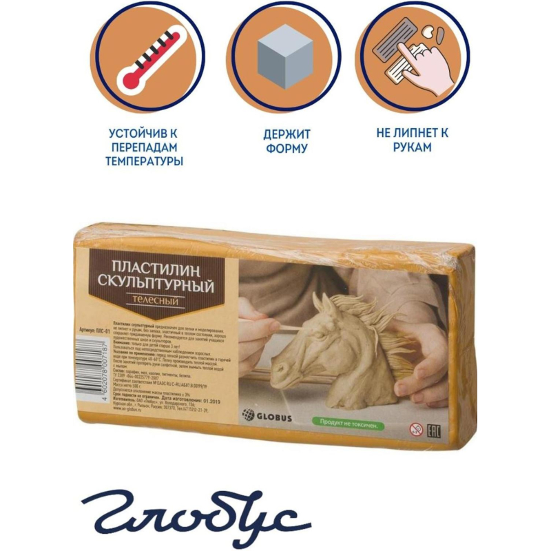 Скульптурный пластилин Глобус сохраняет пластичность и плотность в процессе работы. Поэтому такой пластилин находит применение главным образом в работах, где требуется очень тонкая и четкая проработка формы. Сохраняя все достоинства традиционного пластилина, он идеально держит форму, что позволяет создавать из него небольшие предметы. Устойчив к температурным изменениям. Для изготовления скульптурного пластилина используется воскообразная масса с добавлением минеральных пигментов и наполнителей. Пластилин имеет телесный цвет. Является морозостойким, при заморозке до -50 градусов он сохраняет свои свойства.