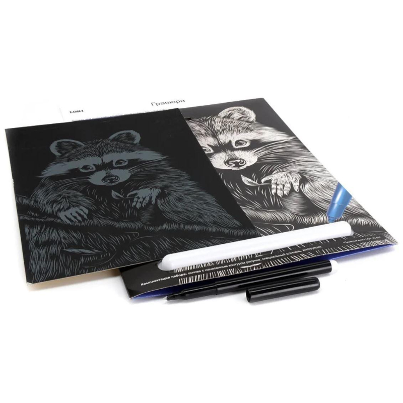 Набор для творчества "Lori Гравюра Пушистый енот" с эффектом серебра. Гравюра - особый вид графического искусства. Сцарапывая верхний слой гравюры специальным штихелем, входящим в набор, ребенок может самостоятельно создать настоящее произведение искусства и почувствовать себя гравером. Готовую гравюру можно вставить в упаковку-рамку. Рекомендуемый возраст: 6+. Комплектация: основа с нанесенным контуром рисунка, специальный штихель, инструкция. Размер гравюры: 18x24 см. Набор поставляется в картонной упаковке.
