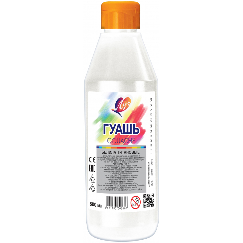 Гуашь ?Луч? белила титановые 500 мл, изготовлена на основе натуральных компонентов и высококачественных пигментов. Предназначена для живописи, художественных и декоративно-оформительских работ. После высыхания образует матово-бархатистое покрытие. Подходит для многих поверхностей, включая дерево, стекло, керамику. Титановые белила в отличие от цинковых имеют теплый оттенок, ими удобно прописывать более белые места. Они устойчивы в соединении с другими красками, меньше реагируют на свет и более долговечны. Гуашь находится в пластиковой герметичной бутылке. Поставляется без кисти. Законодательные и технические документы.