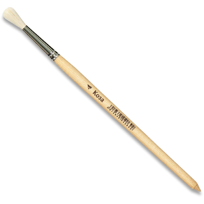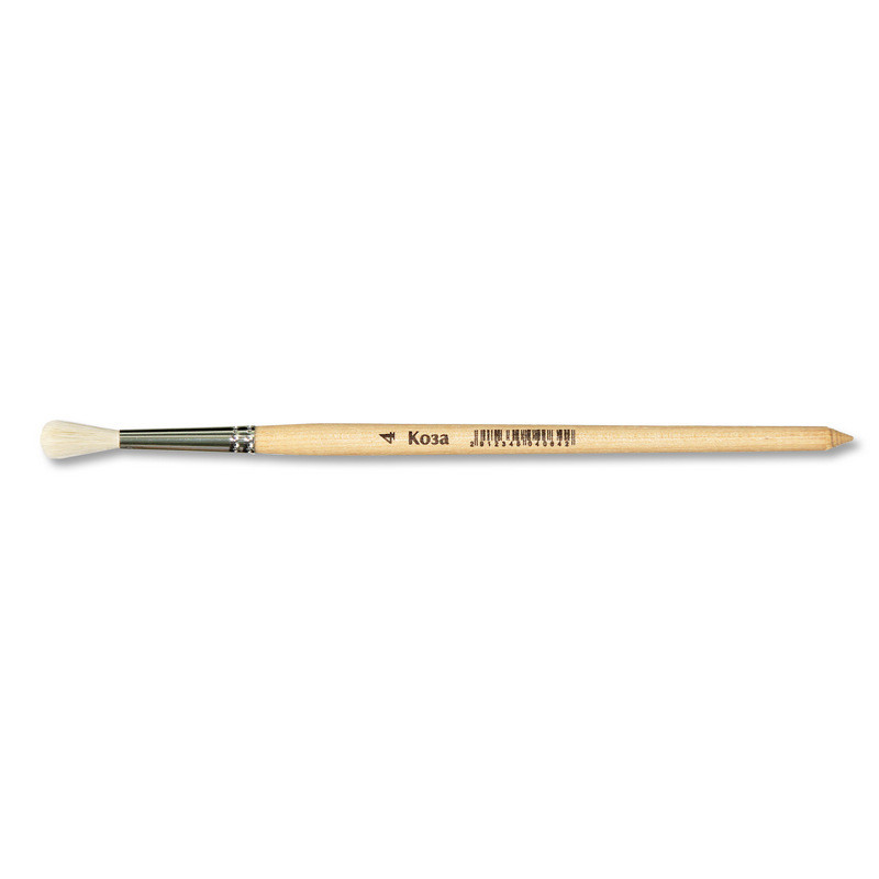 Кисть коза круглая № 4. Мех козы прекрасный материал для кистей, кисти упругие, гладкие, воду держат и отдают хорошо, краску отдают чуть хуже. Одной из главных особенностей - температурная устойчивость. Кисти из козы не боятся горячего воска, что позволяет их использовать для росписи тканей в технике горячего батика. Мазок у кисти нежный, гладкий, без разрывов - однородный. В силу своих природных особенностей, козьи кисти не собираются в конус и относятся к оформительской группе, детали ими не проработаешь. Кисть имеет короткую (14.5 см), деревянную ручку. Предназначена для работы акварелью. Поставляется в полипропиленовом пакете.