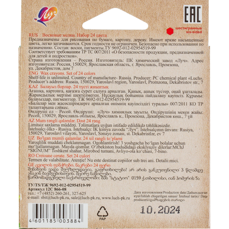 Мелки восковые Луч Zoo шестигранные 24 цветов идеально подходят для детского творчества. Изготавливаются на основе полимерных восков, натуральных наполнителей и высококачественных пигментов. Предназначены для рисования и письма по бумаге, картону, дереву. Такие мелки имеют яркие, насыщенные цвета и откроют юным художникам новые горизонты для творчества, помогут отлично развить мелкую моторику рук, цветовое восприятие, фантазию и воображение. Размер мелков: 8x90 мм. Картонная упаковка оснащена европодвесом. Законодательные и технические документы.
