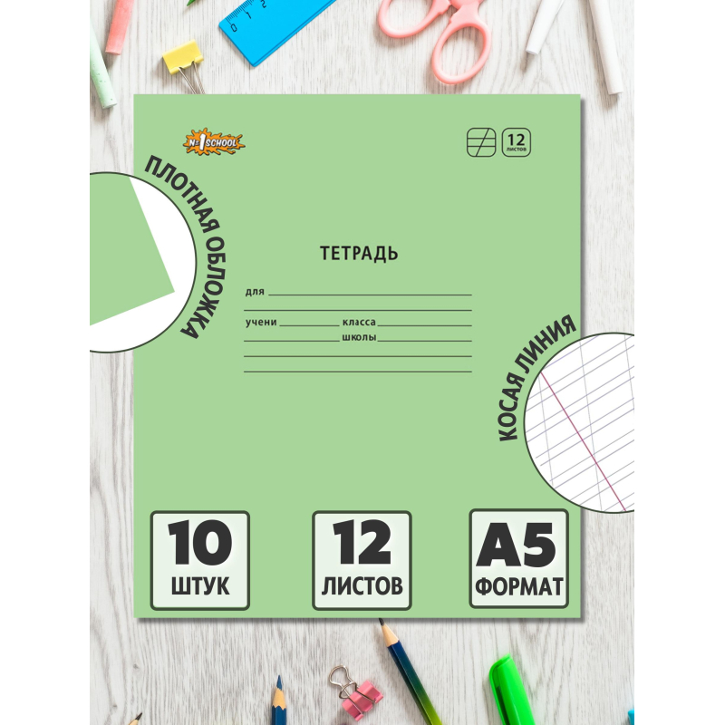 Тетрадь школьная Комус Класс А5 12 л косая линия Зеленый 10 шт./уп