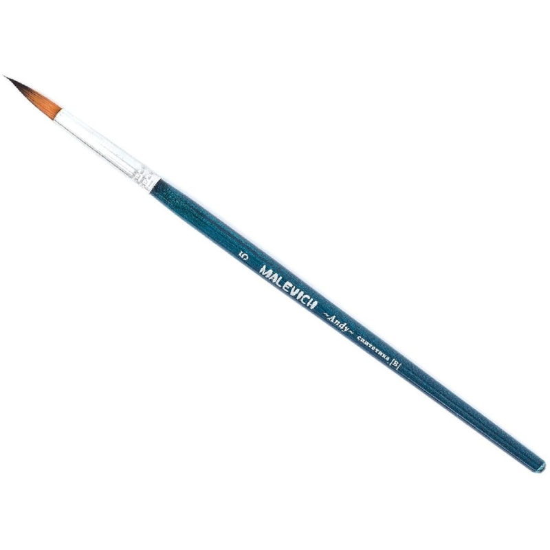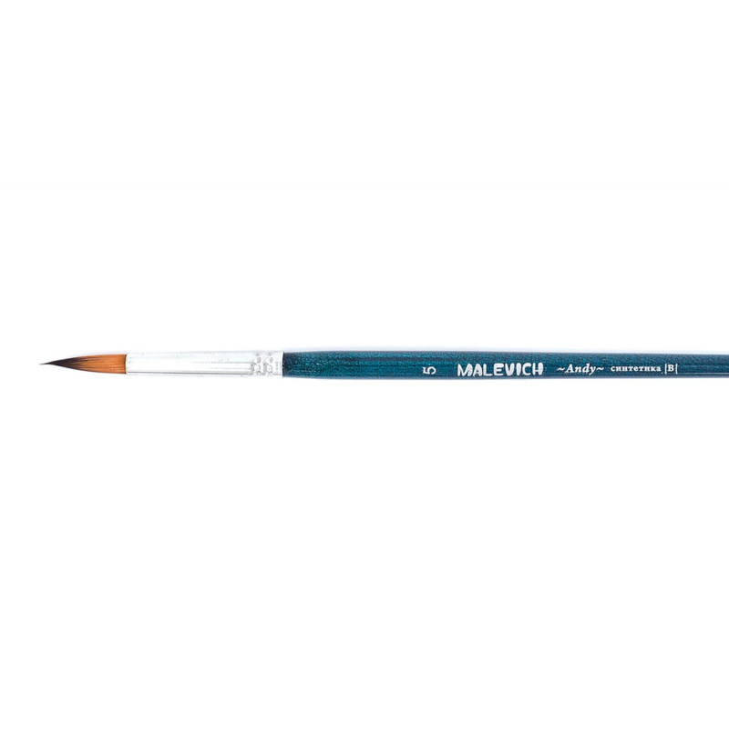 Кисть из синтетики Andy, круглая № 5. Кисть из синтетики серии Andy - это мягкая универсальная синтетика, которая подходит практически для любых видов красок. Ей удобно работать с гуашью, маслом, акварелью, акрилом, темперой. Маслом можно работать в лессировочной технике с разбавителем. Синтетика рыжего цвета с темным кончиком, ручка покрыта синим лаком, ворс закреплен втулкой из латуни с двойной обжимкой. Ручка кисти короткая - 14 см. Длина ворса (выставка) короткая. Номер кисти соответствует диаметру пучка в мм.