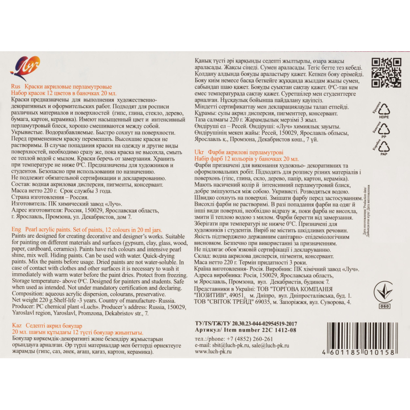 Глянцевые акриловые краски предназначены для художественных, декоративных и дизайнерских работ. Акриловые краски, как и акварельные, легко разбавляются водой, но после высыхания их уже нельзя размочить, образуют несмываемую пленку. Красочный слой эластичен, прочен и долговечен. Красками можно работать практически на любой поверхности. 12 цветов - лимонный перламутровый, розовый перламутровый, красный перламутровый, голубой перламутровый, изумрудный перламутровый, черный перламутровый, белый перламутровый, фиолетовый перламутровый, оранжевый перламутровый, коричневый перламутровый, сиреневый перламутровый, зеленый перл Законодательные и технические документы? в раздел Описание КТ ИМК по артикулам во вложенном файле.
