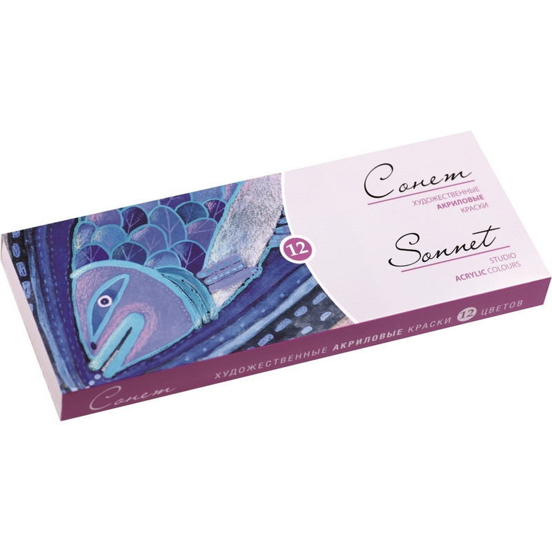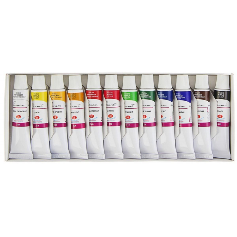 Краски Сонет ТМ "Невская палитра" на акриловой основе, в тубах емкостью 10 мл. Предназначены для нанесения на бумагу, картон. Изделия из дерева, гипса, керамики. После высыхания образует водостойкий слой. Обладают следующими свойствами:- быстро сохнут;- разбавляются водой до необходимой консистенции; - равномерно наносятся, приобретая глянцевую поверхность; - красочный слой эластичен, прочен и долговечен, не образует трещин после высыхания; - прекрасно смешиваются между собой.В набор входят следующие цвета: белила титановые, лимонная, желтая средняя, охра светлая, красная светлая или красная темная, карминовая, зеленая светлая, зеленая ФЦ или зеленая темная, синяя или голубая ФЦ, ультрамарин, умбра жженая, черная. Законодательные и технические документы.
