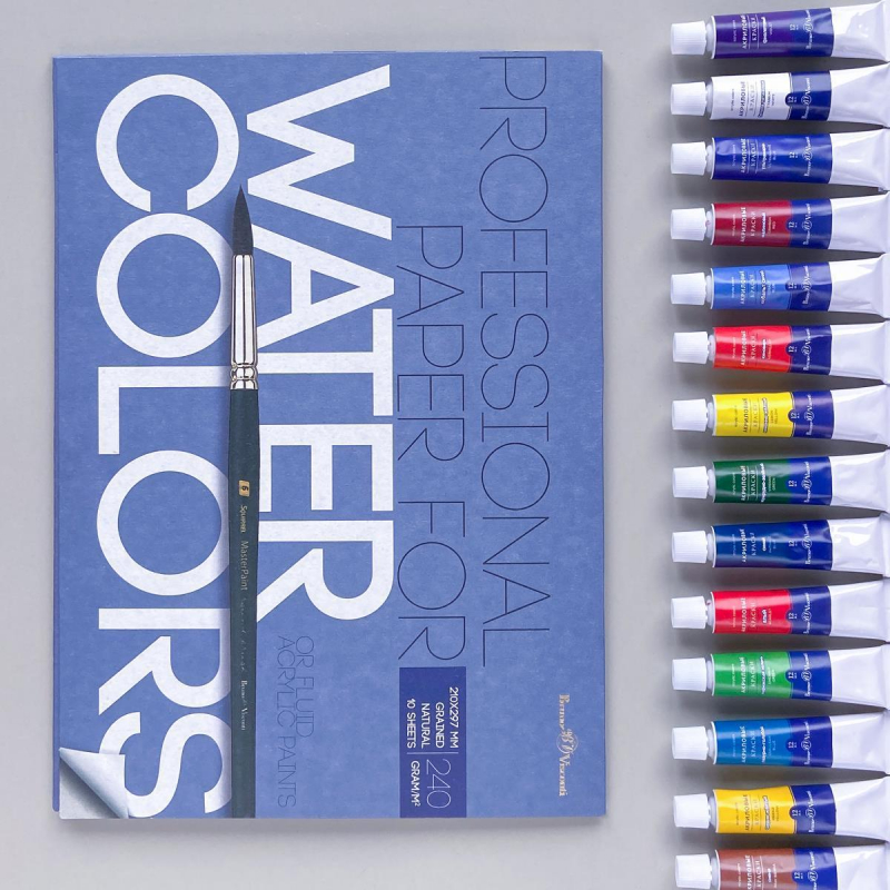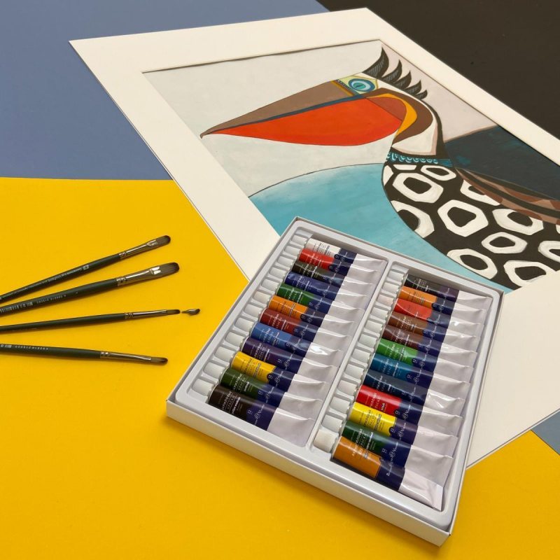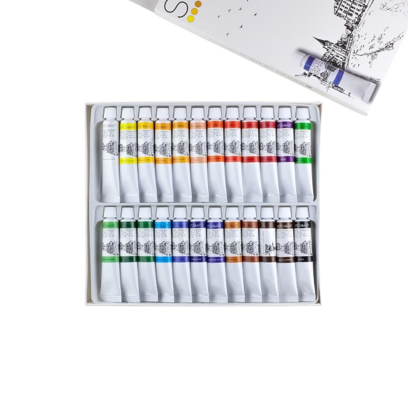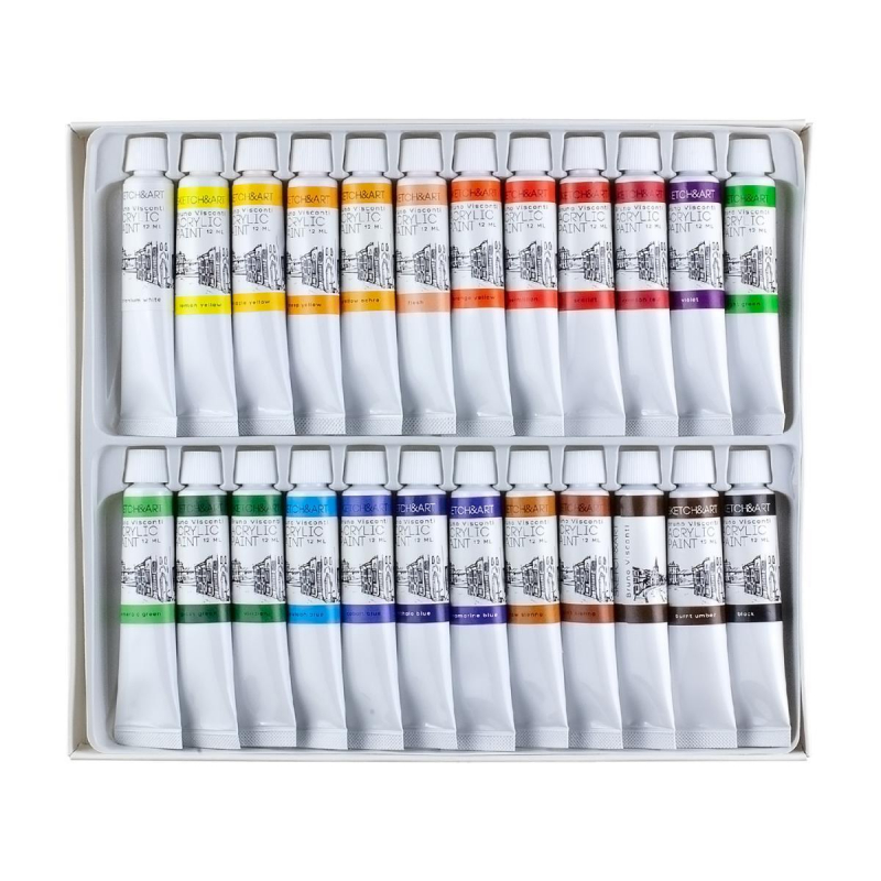 Краски акриловые 24 цветов по 12 мл. Краски применяются для работы по бумаге, картону, холсту, керамике, гипсу, бетону и другим материалам. Их можно использовать для имитации акварели, гуаши, масляных красок. Они легко смешиваются друг с другом. Широкая палитра набора из 24 цветов позволяет добиться плавных переходов оттенков цвета и делать профессиональные зарисовки. Акриловые краски 'Sкetch&Art' обладают высокой степенью укрывистости, свето- и водостойкости после высыхания. Краски легко переносит как низкие температуры, так и высокие (от -20 до 40 С). Набор упакован в коробку-пенал с выдвижным пластиковым ложементом - удобно хранить, использовать для работы в студии и на пленэре. Цвета, входящие в набор: лимонно-желтый; светло-желтый; желтая охра; глубокий желтый; телесный; желто-оранжевый; киноварь; алый; багровый; фиолетовый; ультрамарин; синий; кобальт; лазурный; виридиан; сырая сиена; травяной зеленый; изумрудно-зеленый; светло-зеленый; убра; коричневый; темно-коричневый; черный; белый.