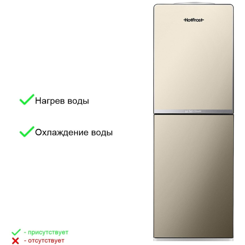 Внимание! Подключайте аппарат к электросети только после заполнения его водой! Включение аппарата без воды может привести к его выходу из строя! Кулер для воды HotFrost V250CE золотистый Внимание, вокруг кулера необходимо обеспечить свободное пространство, не менее 20 см, для свободной циркуляции воздуха. В противном случае аппарат может выйти из строя.Внешний вид и/или характеристики товара могут быть изменены производителем в соответствии с производственным процессом.