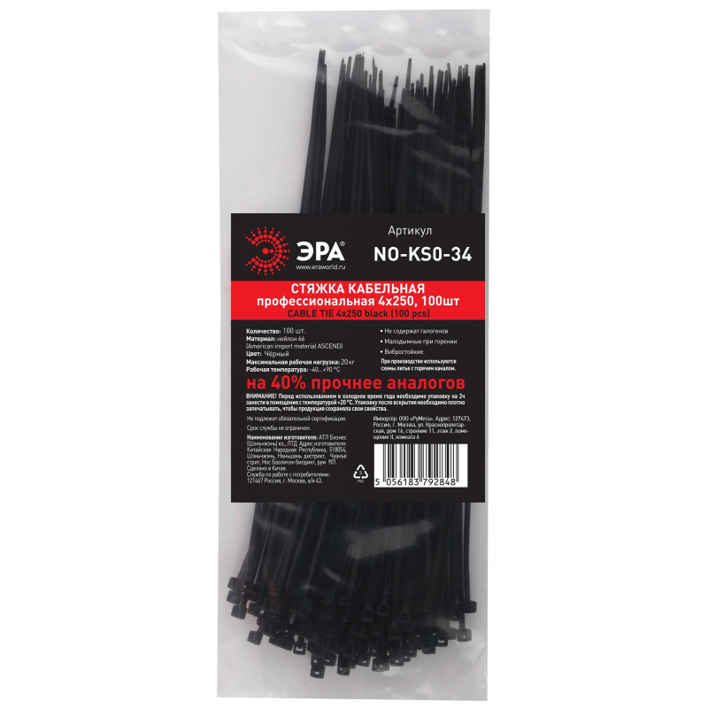 Стяжка (хомут) Эра 250х4 мм черная 100 штук в упаковке (NO-KS0-34) Внешний вид и/или характеристики товара могут быть изменены производителем в соответствии с производственным процессом.