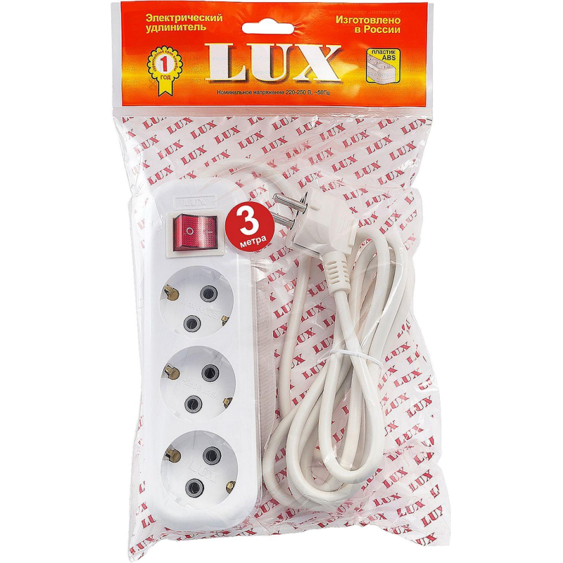 Удлинитель LUX У3-ЕВК-03 3 розетки 3 м с заземлением и выключателем Внешний вид и/или характеристики товара могут быть изменены производителем в соответствии с производственным процессом.