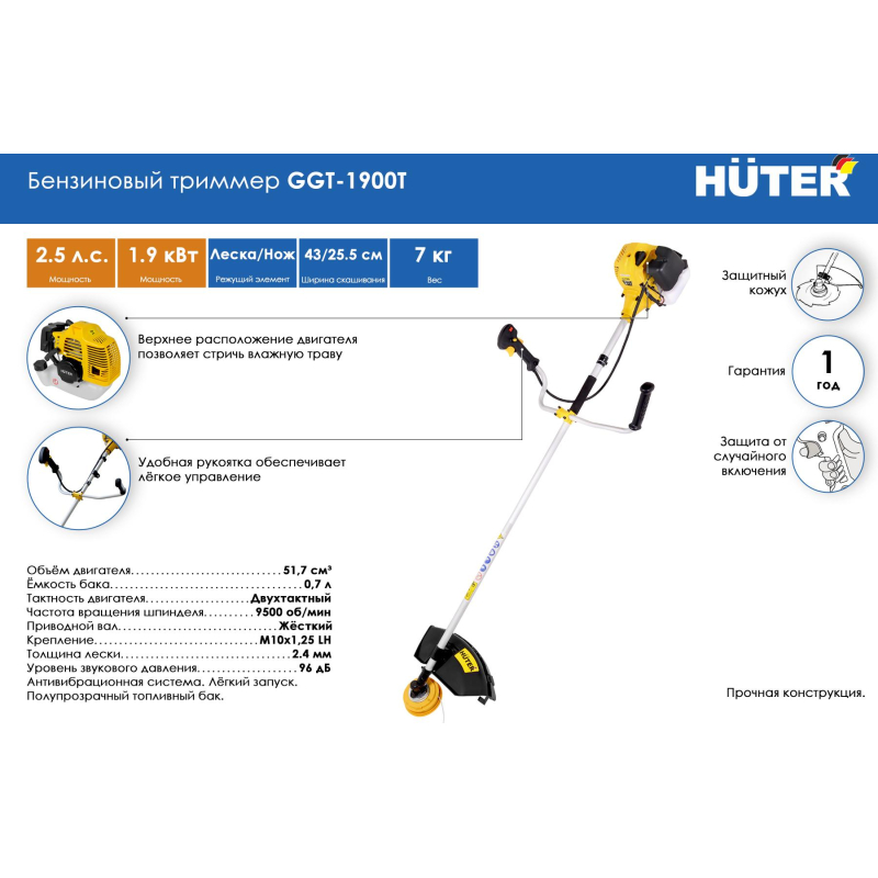 Триммер бензиновый HUTER <nobr>GGT-1900T</nobr> (70/2/11) — отличный ручной моторизированный инструмент для скашивания травы. Представляет собой современный вариант традиционного для этого вида работ ручного инструмента — косы. Косить траву, особенно если она высокая, триммером очень удобно. Как правило, владельцы участков отдают приоритет бензиновым моделям, ведь не на каждой даче есть электричество, а провода создают дополнительное неудобство. Главное — это выбрать нужный триммер, которым будет удобно работать. Неплохо, чтобы его мощность позволяла легко снимать даже древесную поросль и кустарники. Модель триммера <nobr>GGT-1900T</nobr> отличается от <nobr>GGT-1900S</nobr> только неразъемной (неразборной) штангой, остальные параметры одинаковые. Преимущества: — Бензиновый триммер Huter обладает полной автономностью, можно работать где угодно без связи с источниками энергии. — Топливный бак устройства полупрозрачен и позволяет визуально следить за уровнем его наполнения. — Удобная рукоятка позволяет регулировать параметры агрегата, прочно его удерживать, а так же направлять его рабочую часть в нужное место. — Надежный и оборотистый двухтактный двигатель с системой антивибрации и легким ручным запуском позволяет долго работать. — Управление триммером расположено прямо на рукоятке. Система безопасности: — Защитный кожух оберегает от отскоков камней и другого мелкого мусора в сторону пользователя. — Блокиратор курка газа позволяет избежать случайного нажатия курка и вращения режущего инструмента при заведенном двигателе. — Антивибрационная система триммера повышает комфорт при работе триммером. Обратите внимание! Топливную смесь следует приготавливать из бензина с октановым числом не менее 92 и специального масла. Необходимо использовать высококачественное масло, предназначенное для двухтактных двигателей с воздушным охлаждением. Запрещается использование масла, предназначенного для <nobr>2-х</nobr> тактных двигателей с водяным охлаждением (для лодочных моторов)! Пропорция приготовления указывается производителем масла. Если пропорция не указана, то используется 1:40.КомплектацияДиск;Триммерная головка;Плечевой ремень;Инструкция;Гарантийный талон.Внешний вид и/или характеристики товара могут быть изменены производителем в соответствии с производственным процессом.