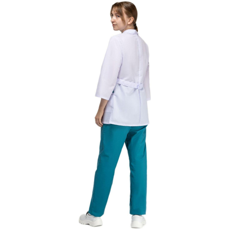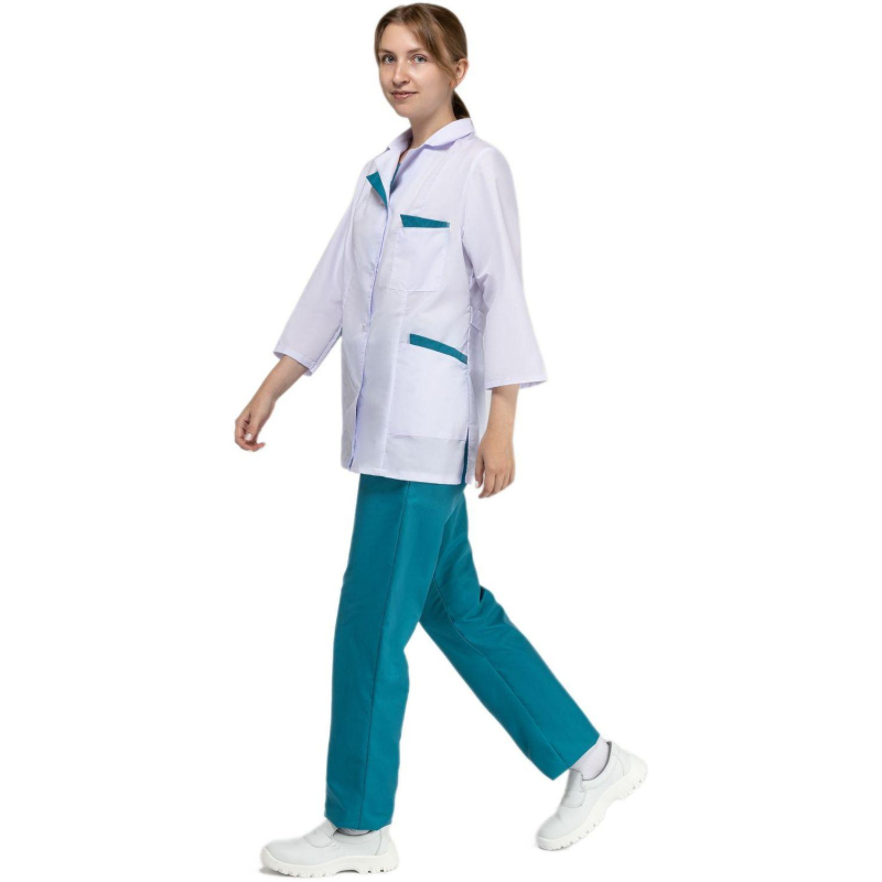Костюм медицинский м01-КРБ (куртка+брюки). Размер: 60-62. Рост: 170-176. Куртка с застежкой на пуговицы, накладными карманами и с фигурной отделкой на лацканах и карманах. Ширина по линии талии регулируется хлястиком. Брюки свободного покроя на резинке. Ткань: Ти-Си (состав: 65% - полиэфир, 35% - хлопок). Плотность: 120 гр/м2.Коллекция медицинской униформы м01 представлена комплектами куртка с брюками м01-КБР и халатами м01-ХЛ. Продукция не является изделием медицинского назначения, производится согласно требованиям ГОСТ 12.4.280-2014. Рекомендуется для работников медицинских, санитарных, лечебно-профилактических и других организаций или учреждений здравоохранения: высший, средний и младший персонал (врачи, медицинские сестры, акушеры, техники, лаборанты, массажисты, фармацевты, сиделки, санитарки и т.д.), административно-хозяйственной группы (заведующие, кладовщики, кухонный персонал и т.д.). Изделия отшиты из белой ткани, но с сиреневым оттенком, связано это со спецификой отбеливания, чтобы ткань не желтила. Цвет стабилизируется после нескольких стирок.
