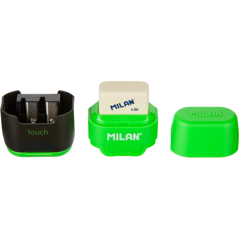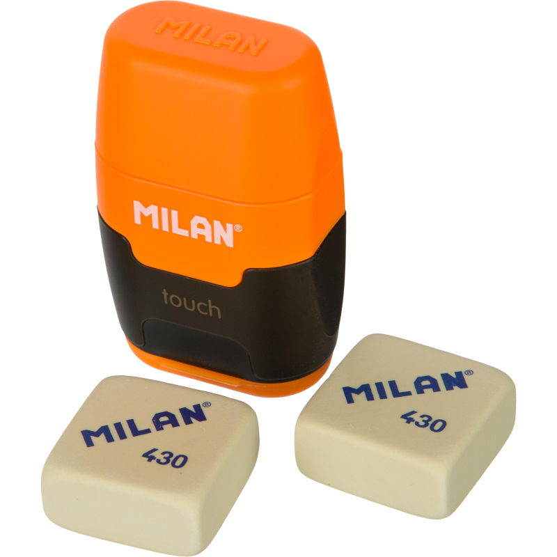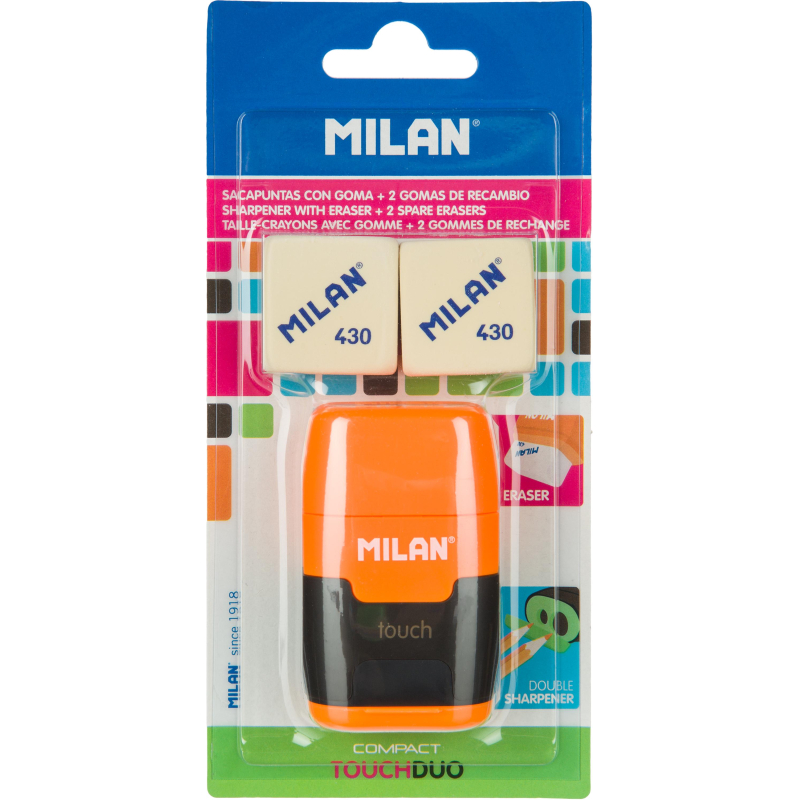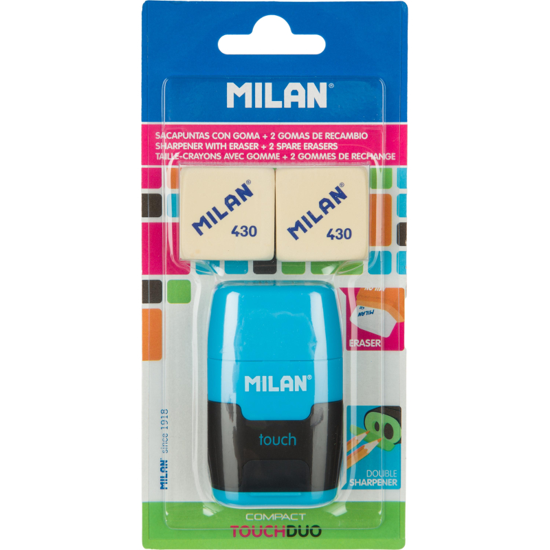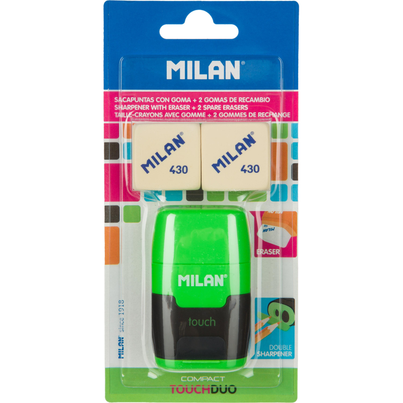 Набор ластик-точилка для карандашей с двумя отверстиями, коллекция Compact Touch и 2 мягких каучуковых ластика. Мягкий квадратный ластик из синтетического каучука 430 может использоваться для стирания чернографитного карандаша со всех типов бумаги. Точилка для стандартных и утолщенных карандашей c прочным лезвием из углеродистой стали, со встроенной системой безопасных лезвий. Набор поставляется в блистере с европодвесом. Цвет в ассортименте: синий, оранжевый, розовый и зеленый (без возможности выбора).