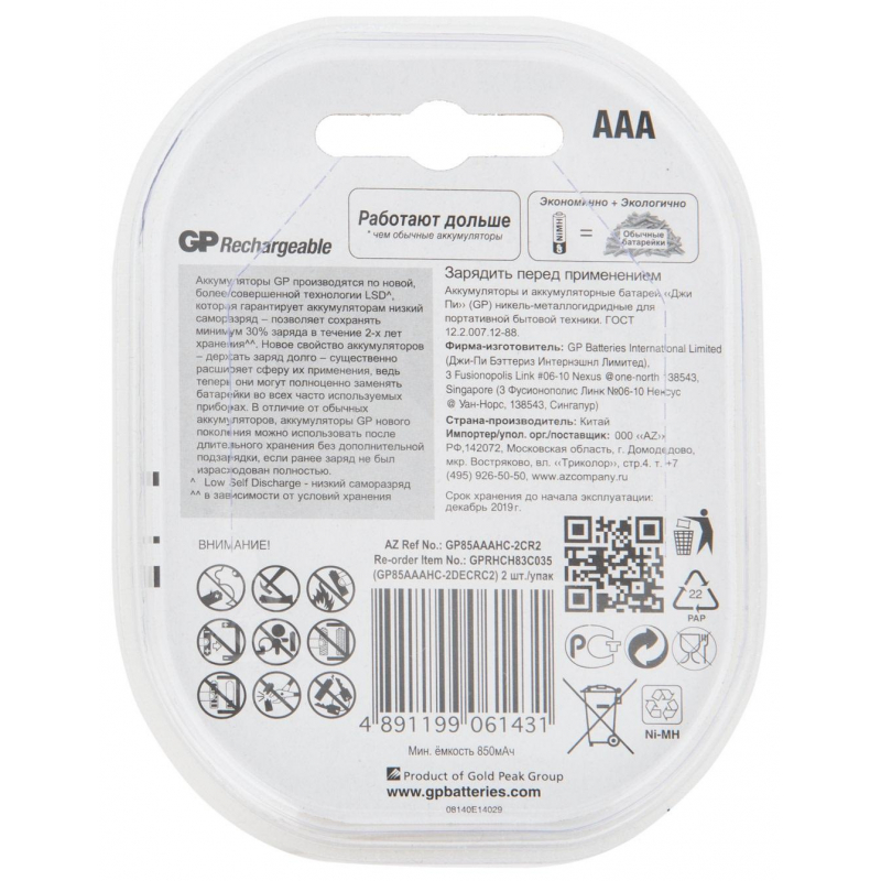 Аккумулятор AAA 850 мАч GP 850 series 85AAAHC 2 штуки в упаковке NiMh Товар относится к ценовому сегменту "бюджет". Имеет базовые характеристики и более простую упаковку. Отвечает основным требованиям потребления. Внешний вид и/или характеристики товара могут быть изменены производителем в соответствии с производственным процессом.