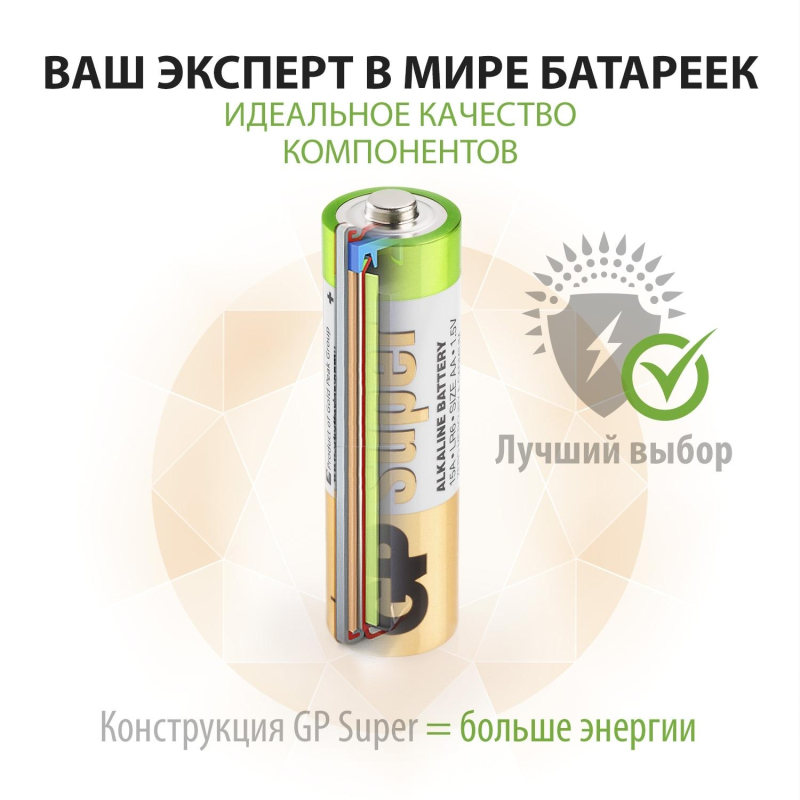 Батарейка АА пальчиковая GP Super (4 штуки в упаковке) Батарейки GP меняют дизайн - потребительские свойства, модели, артикулы, весогабаритные характеристики, тип упаковки остаются без изменений. Внешний вид и/или характеристики товара могут быть изменены производителем в соответствии с производственным процессом.